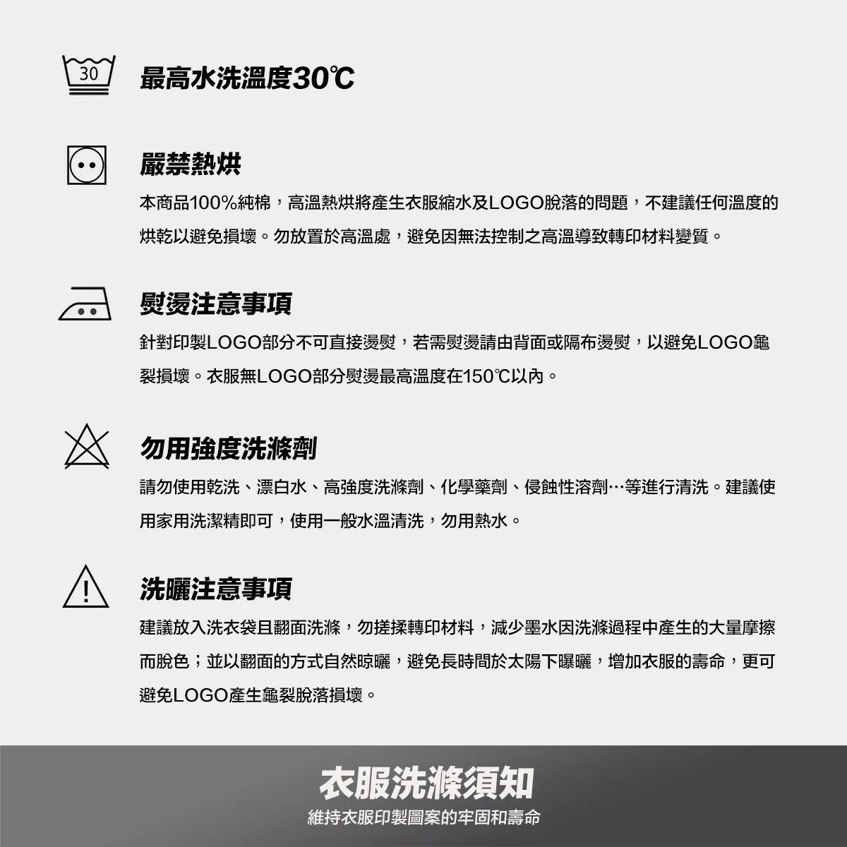 1. 100%純棉衣物嚴禁高溫,也不建議烘乾。高溫會造成衣物縮水,以手洗/洗衣機洗滌後,正常的掛曬風乾即可。若環境的限制下不得不使用烘乾機,也建議把溫度調整為冷風,或者不要太高溫進行烘乾行為。