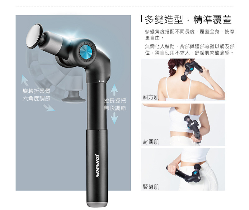 .旋轉折疊臂,可六角度調節,握把可無段調節拉長,按摩更自由