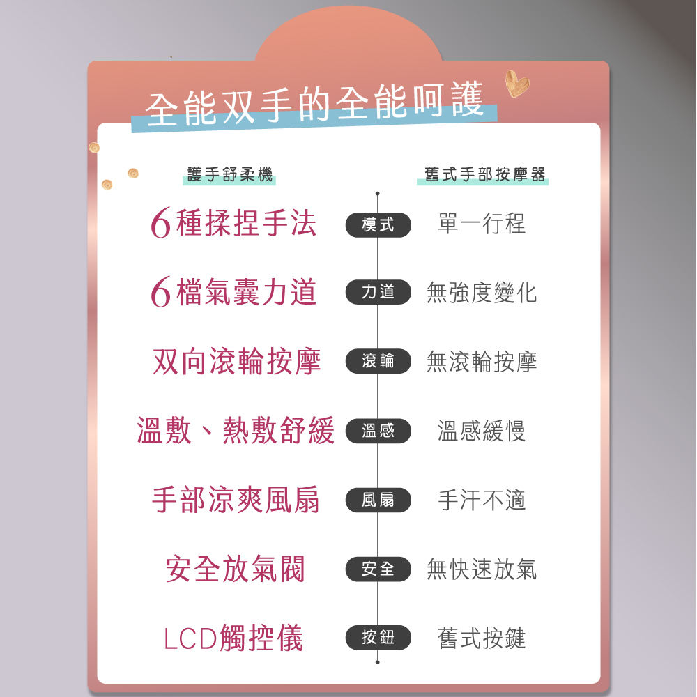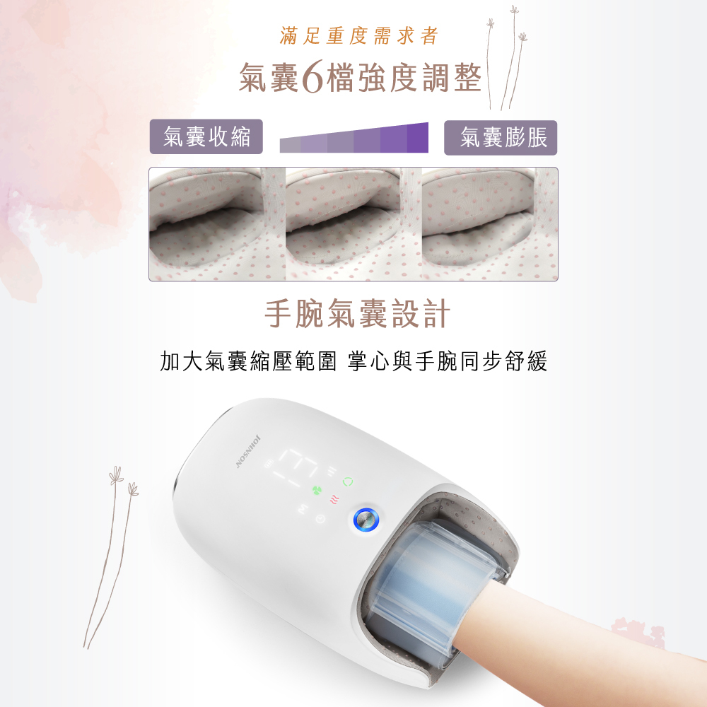 氣囊按壓6種力道強度調整,新增手腕氣囊,掌心與手腕也能同步舒緩