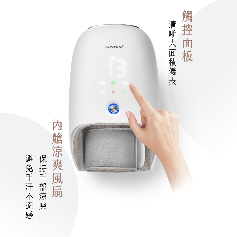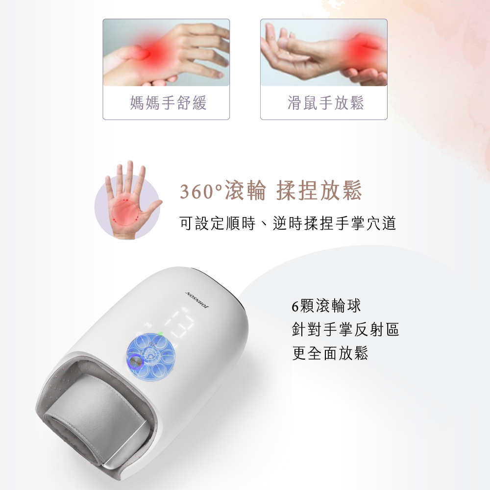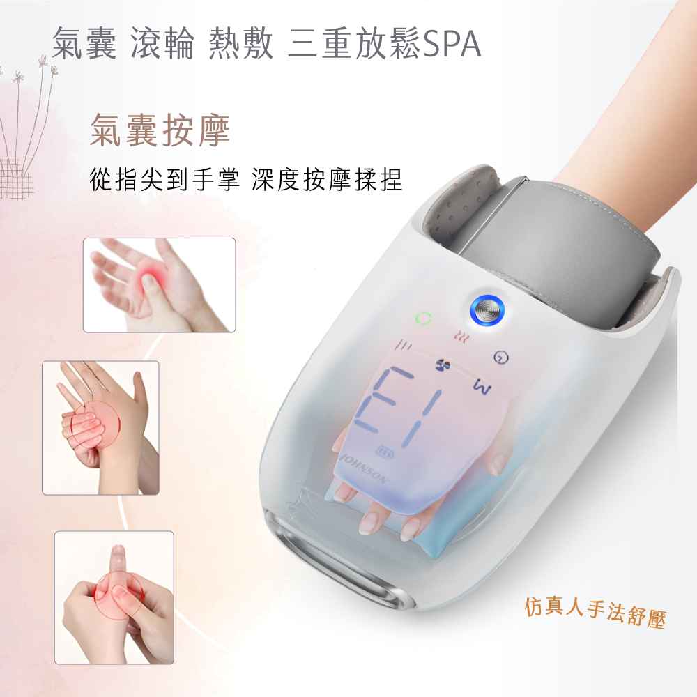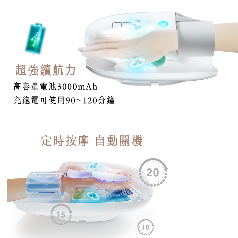 手部三重SPA放鬆:6種氣囊揉捏模式、360°掌心滾輪、內艙恆溫熱敷舒緩