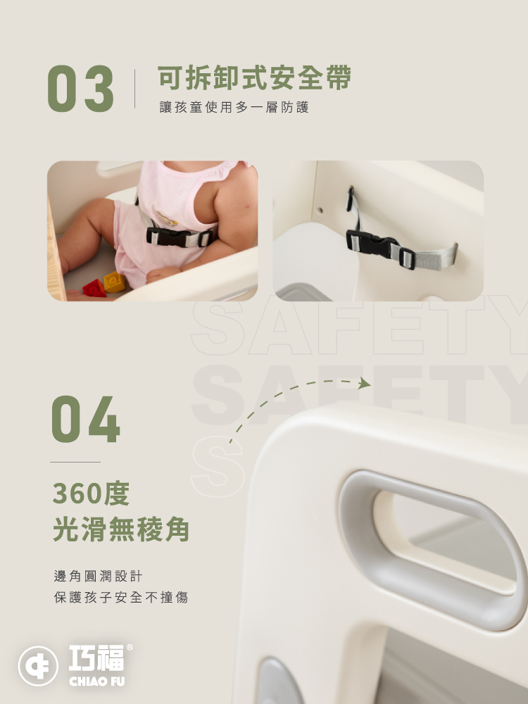 ■可拆卸式安全帶,讓孩童使用多一層防護