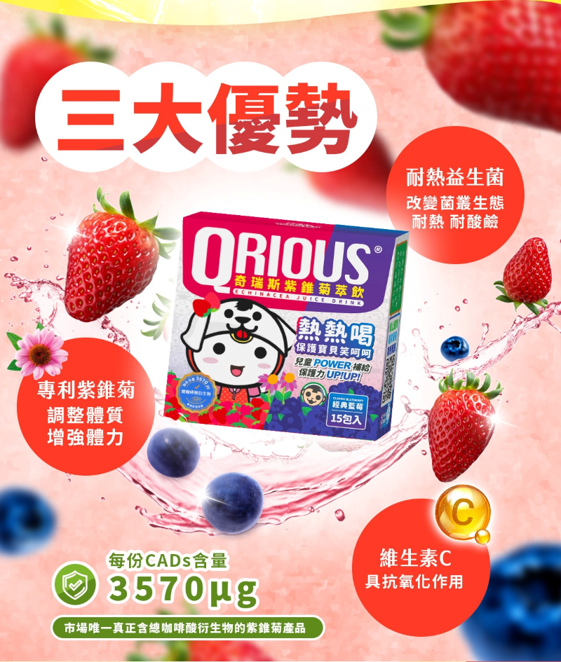 ✔「奇瑞斯紫錐菊+獨家菌種耐熱100ºc+維他命C+真實草莓凍乾研磨粉」