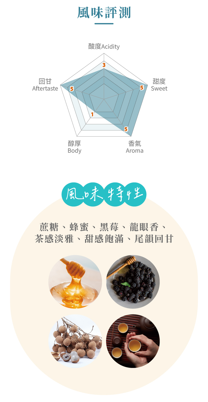 風味敘述:清甜白花香調、櫻桃、黑莓果、楓糖、榛果、烏龍茶般甘甜