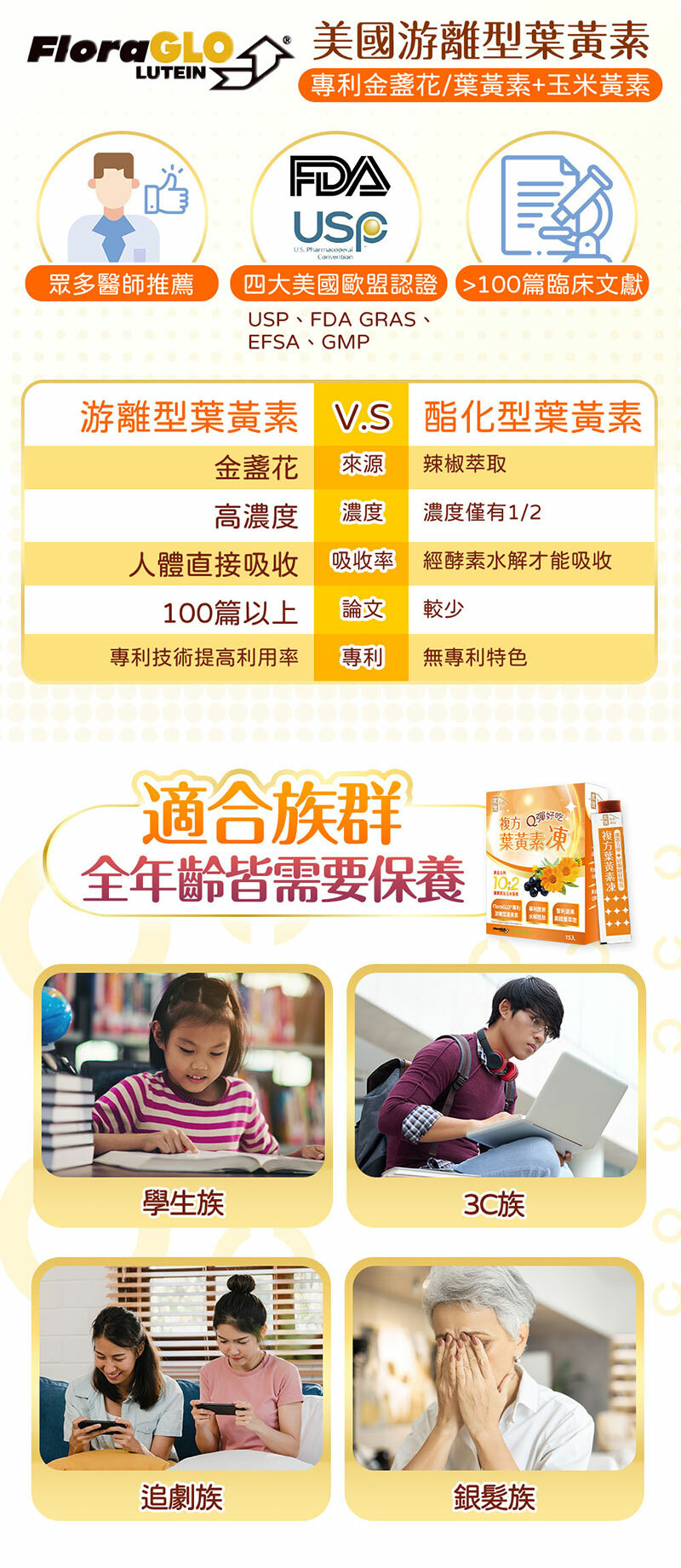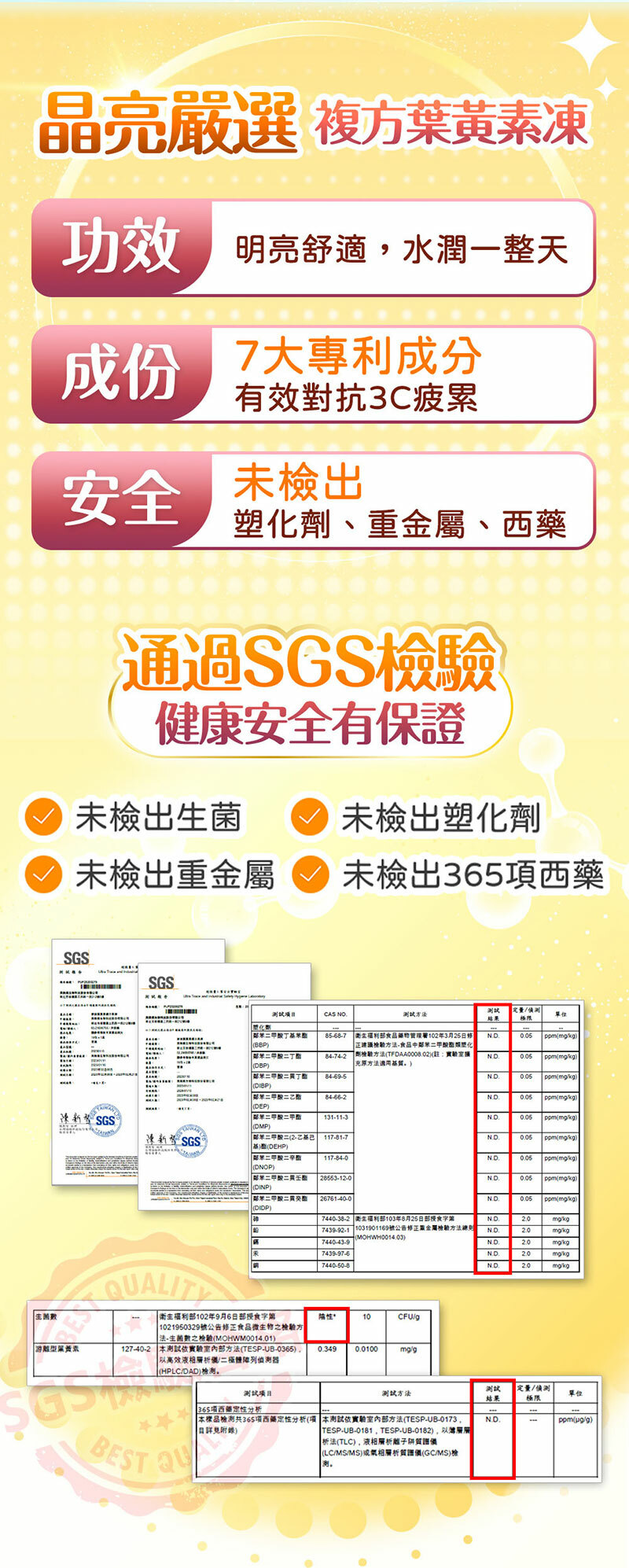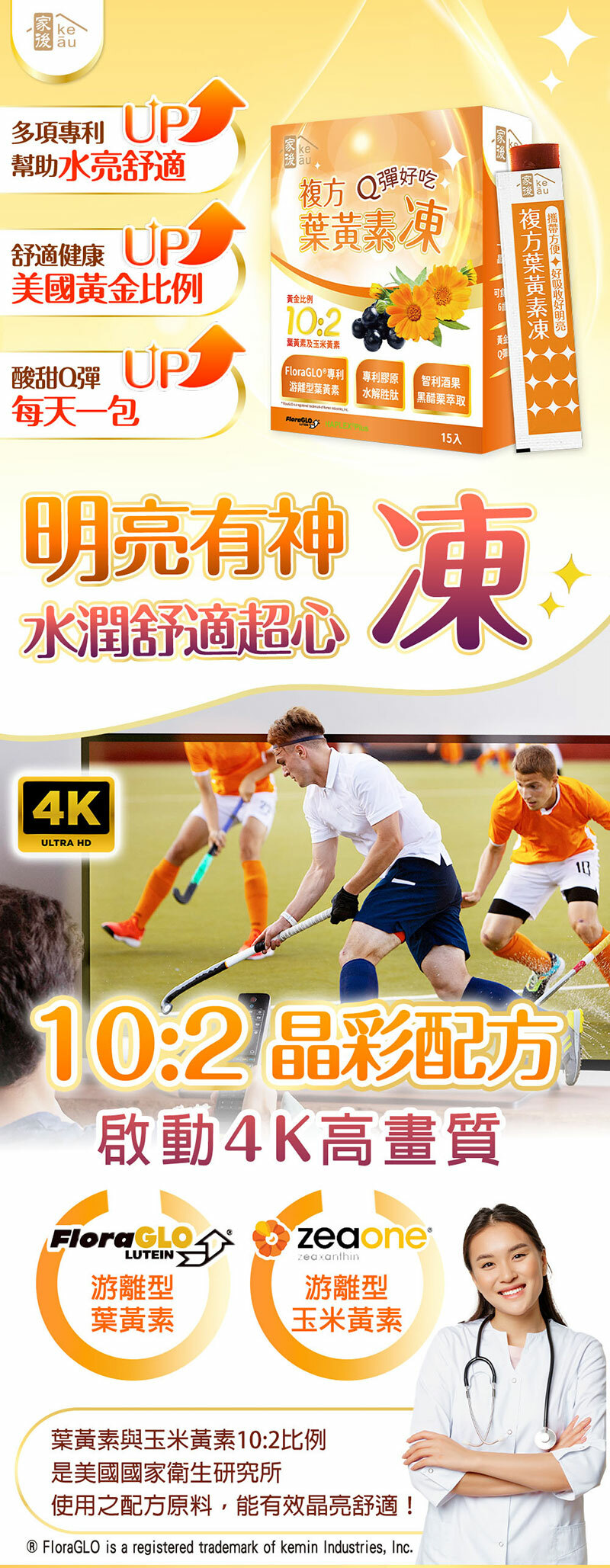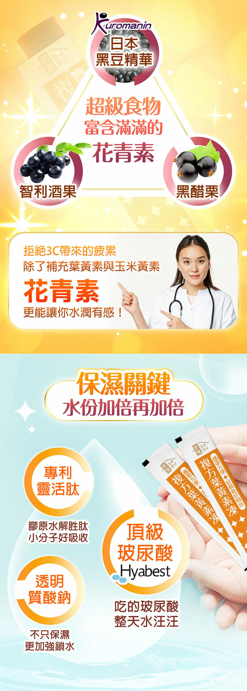 成分 :水、D-木醣醇(甜味劑)、蘋果濃縮汁、澄清百香果濃縮汁、鳳梨濃縮汁、刺槐豆膠、玉米糖膠、專利膠原蛋白水解胜肽(豬來源)、香料、FloraGLO®專利游離型葉黃素(辛烯基丁二酸鈉澱粉、乾葡萄糖漿、蔗糖、葉黃素(金盞花萃取物)、抗壞血酸鈉(維生素C) 、水)、洋菜粉、金盞花抽出物(蔗糖、辛烯基丁二酸鈉澱粉、金盞花抽出物(含玉米黄素5%))、流行鏈球菌發酵物(含透明質酸鈉)、檸檬酸、黑豆皮抽出物、智利酒果粉、複方維生素C(L-抗壞血酸,柑橘萃取、米糠粉、黑醋栗萃取物(黑醋栗萃取、麥芽糊精)