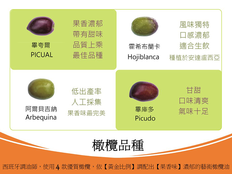 西班牙調油師精選四種優質橄欖,依完美比例調配