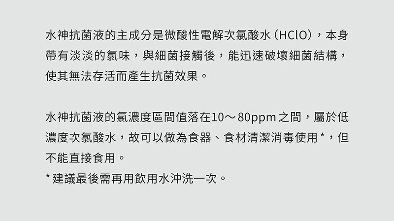 ● 次氯酸水非飲用水,切勿飲用。