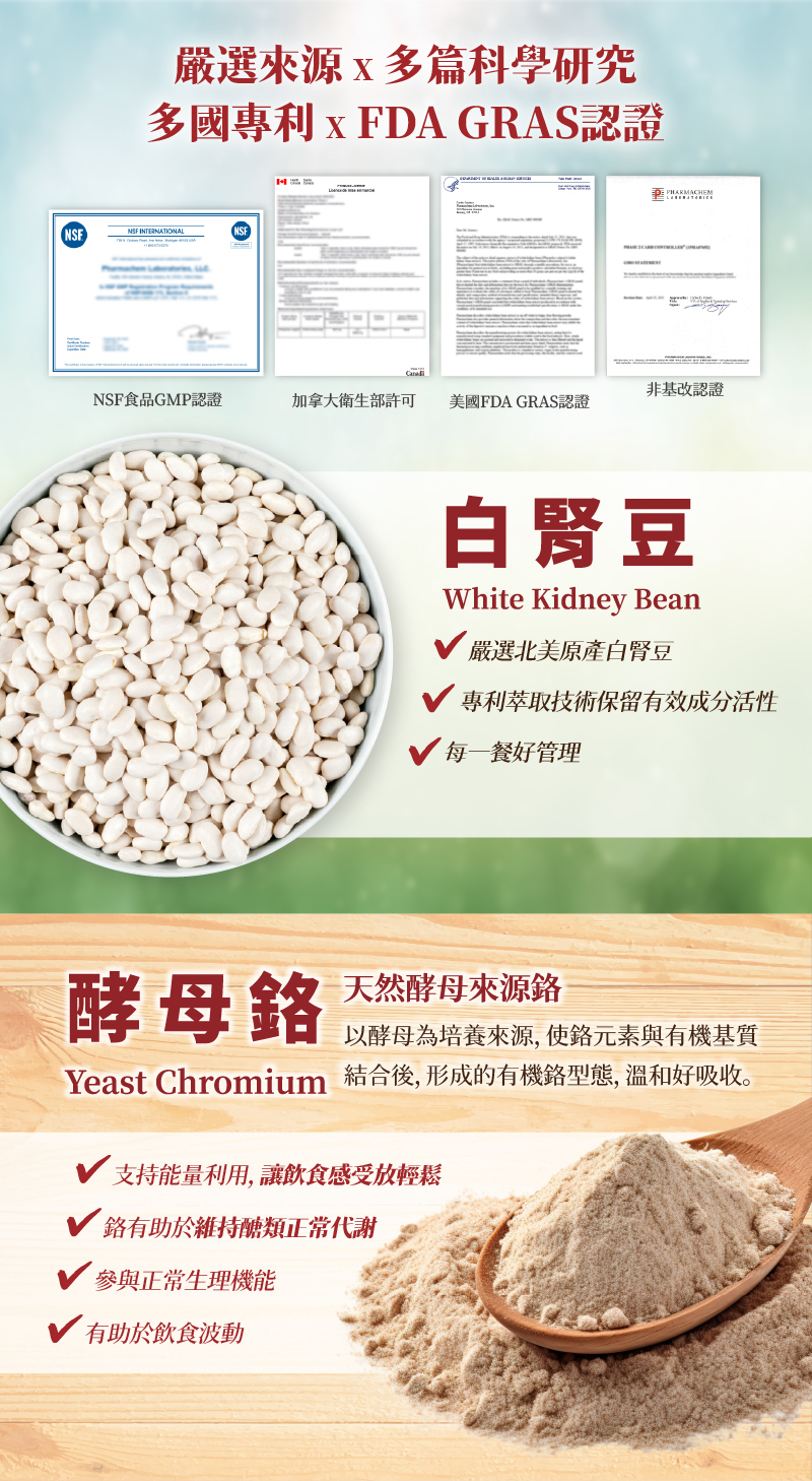嚴選北美原產白腎豆×專利萃取技術保留有效成分活性×FDA GRAS認證