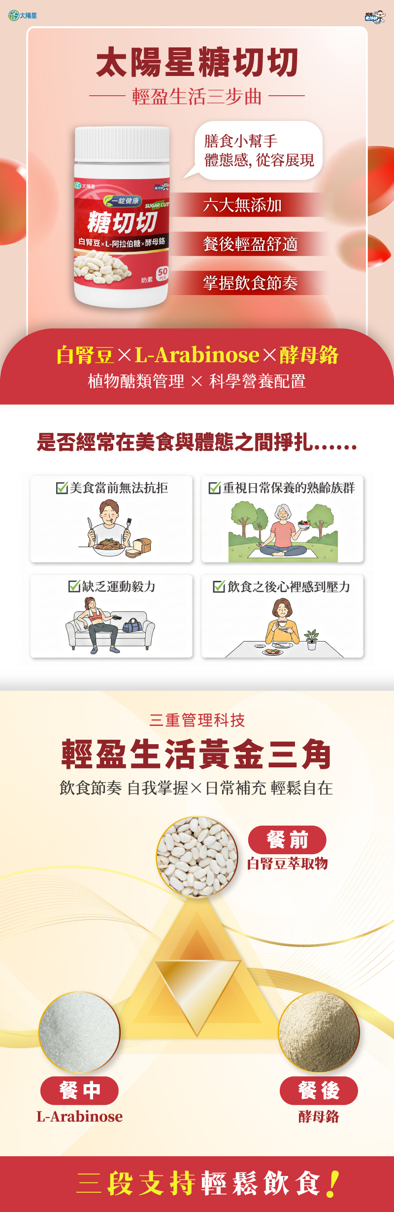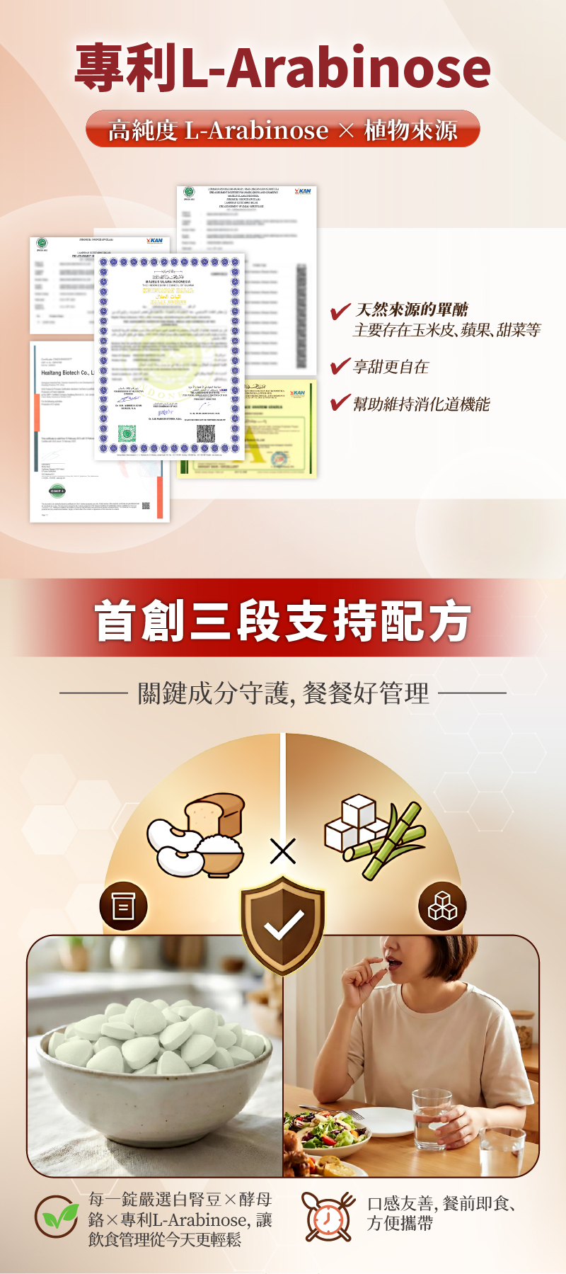 ☆輕盈生活黃金三角:餐前白腎豆萃取物、餐中L-Arabinose、餐後酵母鉻