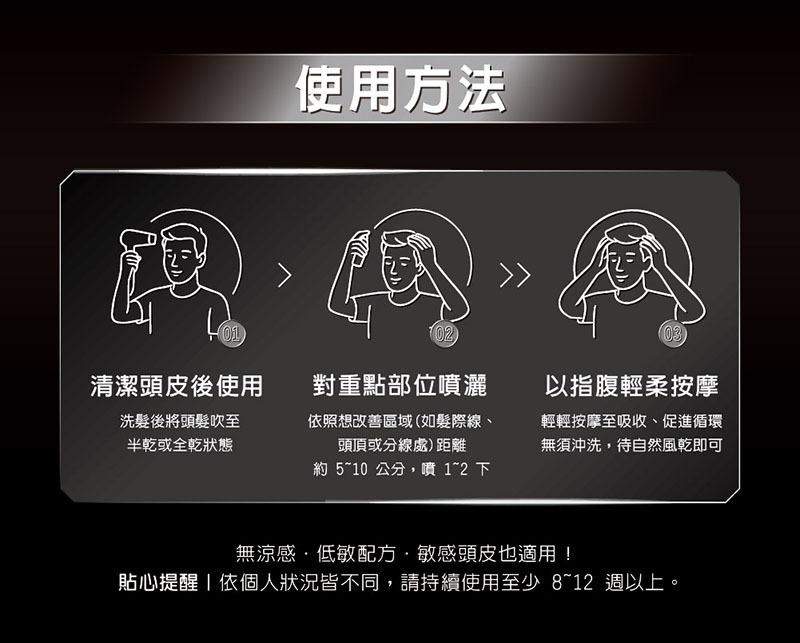 清爽不油膩,男女都能安心使用。每天簡單一噴,養護頭皮、減少掉髮、增強新生力持續使用讓你重拾濃密與自信!