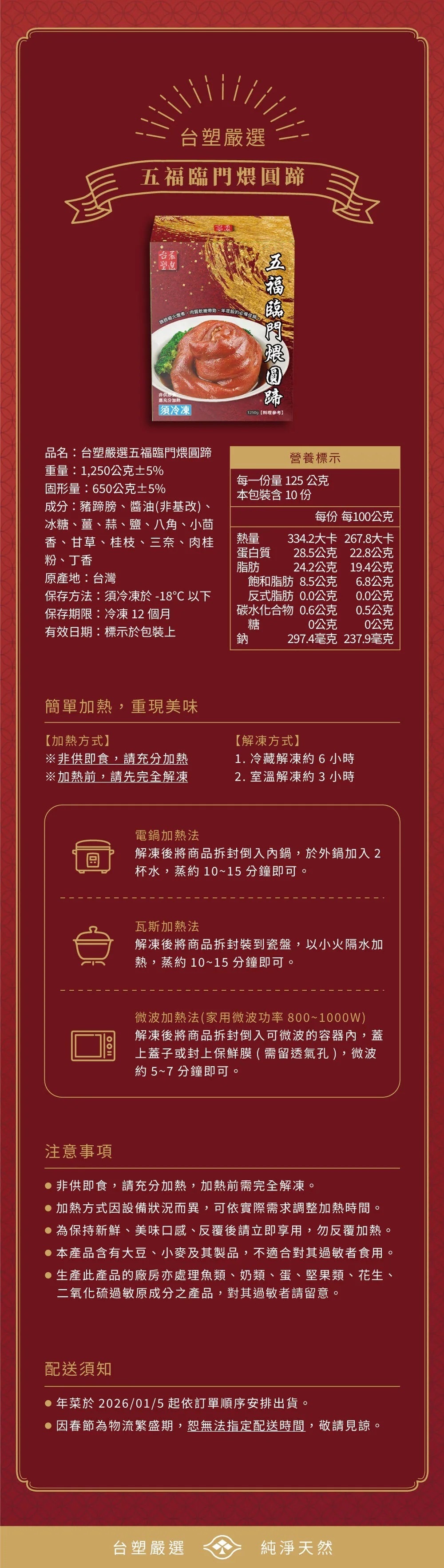 嚴選台灣豬後腿前足,經獨門配方醃製48小時,再結合現代低溫燉滷科技。外皮Q彈、肉質軟嫩,滿滿的膠原蛋白紅亮誘人,是年節餐桌上最具氣勢的首選主菜。