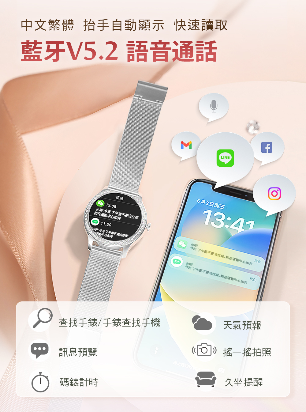 ● 藍牙語音通話音樂手錶,訊息、來電不漏接