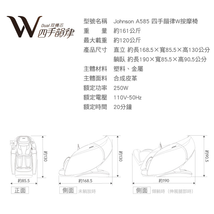 | 【喬山】A585 四手韻律W按摩椅 四手按摩 .上下設置4D/3D双V按摩機芯 .柔性双導軌166°平躺 如頭等艙般舒適 .兩段式軌道可延展角度,讓身體達到最佳舒適平躺姿態 .雙項智能AI檢測,訂製專屬方案 透過AI體型檢測及健康檢測,提供最適化的按摩程式 .3D環抱式全身氣囊,沈浸式享受 3D氣囊包覆全身10個按摩區域,體驗從頭到腳緊密包覆 .內建喇叭,手機無線快充插槽 --------------------------- 型號名稱 【喬山】A585 四手韻律W按摩椅 四手按摩 重 量 約161公斤 最大載重 約120公斤 直立尺寸 約 長168.5 x 寬85.5 x 高130 公分 躺臥尺寸 約 長190 x 寬85.5 x 高90.5公分 主體材料 塑料、金屬 主體面料 合成皮革 額定功率 250W 額定電壓 110V~50Hz 額定時間 20分鐘 顏 色 薄暮黑、朝霞紫、杏月白 R53481 RoHS 本商品通過經濟部標準檢驗局-安全檢驗合格認證 內含無線模組合格標籤 CCAG24LP0020T9 / CCAP21Y10010T8 ◎本產品文案為原廠所提供,若有變動 敬請參照實際商品為準。 ◎圖片會因電腦廠牌不同、螢幕解析度、拍攝燈光、環境顏色影響而有色差問題,請以實際收到商品為準。 ※組裝中/安裝完成 需再搬移至其他位置、地址、樓層,另需酌收移機費用。 ※本產品鑑賞期非試用期,商品經組裝後,商品無法恢復全新狀態(原廠包裝、損傷、缺件等),商品回收後配定須為福利品折價販售,我司將向您收取商品折舊整新費用。(已給付之搬運費用、已回收之舊機將無法退還)。 ※保固期間內(離島地區無保固),家用器材未經允許使用於營業地點、公司行號、工廠或其他公共場所,本公司保留保固條件之說明權。 ----------※【※注意※】※---------- 此按摩椅設計 因扶手無法拆卸,實際搬運寬度需達78cm以上,務必先確認自家樓梯、樓梯轉折處(電梯寬度和尺寸)以及進出門可容納商品搬運之尺寸。 若因空間限制 無法進入而導致商品需另約時間或取消訂購,我們將酌收空跑費用; 因空間限制 需以吊車方式配送,請提前告知以利後續吊車安排。 ※提醒您,本商品拆箱組裝後,如退貨需酌收折舊服務費(已給付之搬運費用將無法退還;若退貨須由吊車搬運,此吊車費用由消費者負擔)。 |