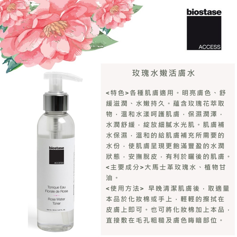 蘊含玫瑰花萃取物,溫和水漾呵護肌膚,保濕潤澤,水潤舒緩,綻放細膩水光肌。