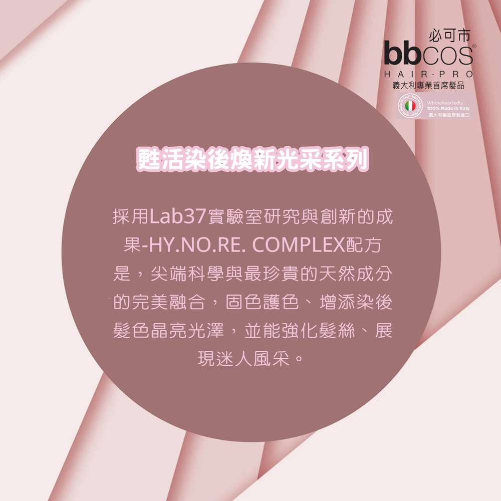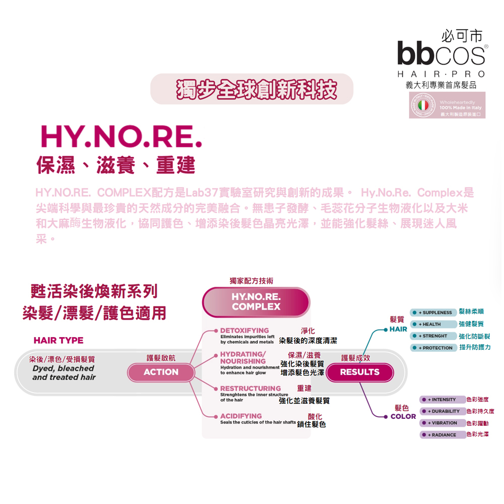 ☆水合作用使髮絲柔順平滑,令人難以置信的改善毛躁效果,是所有髮質的理想選擇☆最新的獨家科技HY.NO.REComplex的活性成分增強染後髮色的亮度和色彩鮮豔度,強化滋養髮絲,延長染後髮色持久度。