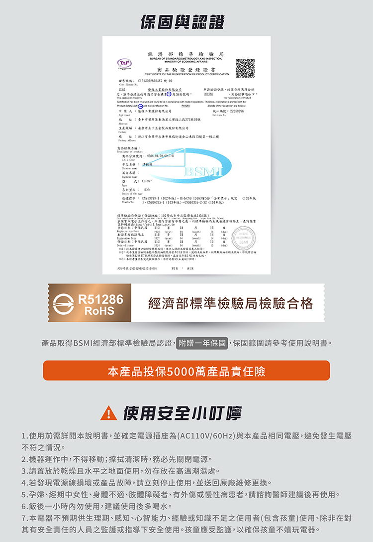 ◆本產品投保5000萬產品責任險。