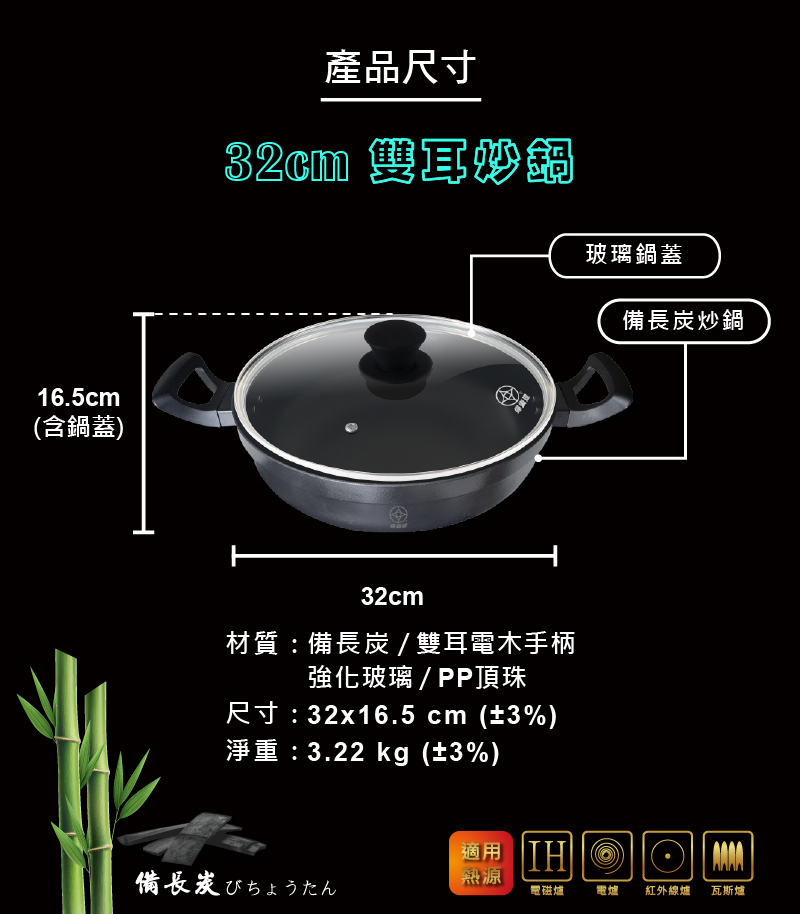 2.商品組合/規格:炒鍋鍋身→備長炭;炒鍋鍋蓋→強化玻璃、PP頂珠 尺寸:炒鍋(含蓋):32cmx16.5cm(+-3%);矽膠鍋鏟:31cm