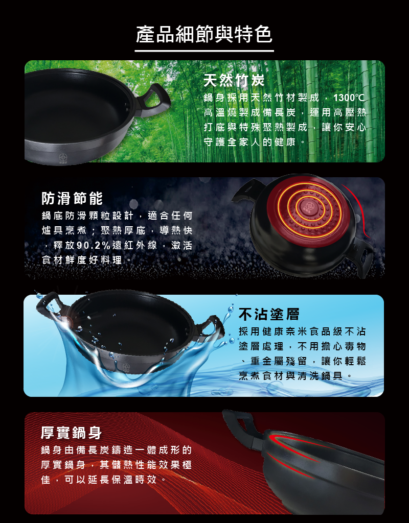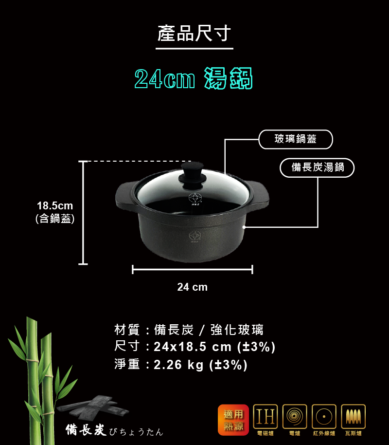 2.商品組合/規格:炒鍋鍋身→備長炭;湯鍋蓋→強化玻璃 尺寸:24cm x 18.5cm ±3%