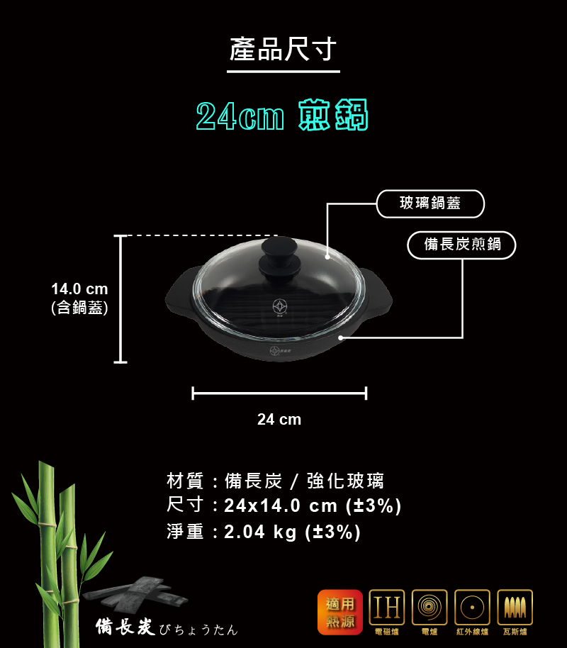 2.商品組合/規格:炒鍋鍋身→備長炭;煎鍋鍋蓋→強化玻璃 尺寸:煎鍋(含蓋):24cm x 6cm ±3%