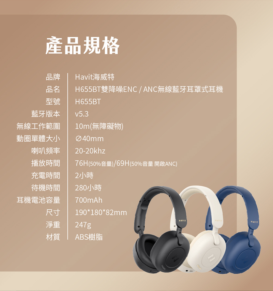 1.商品品名: 【海威特HAVIT】H655BT雙降噪ENC/ANC無線藍牙耳罩式耳機