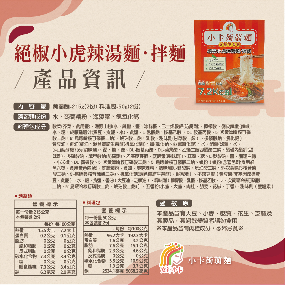 "1.商品品名:小卡蒟蒻麵-絕椒小虎辣湯麵/拌麵