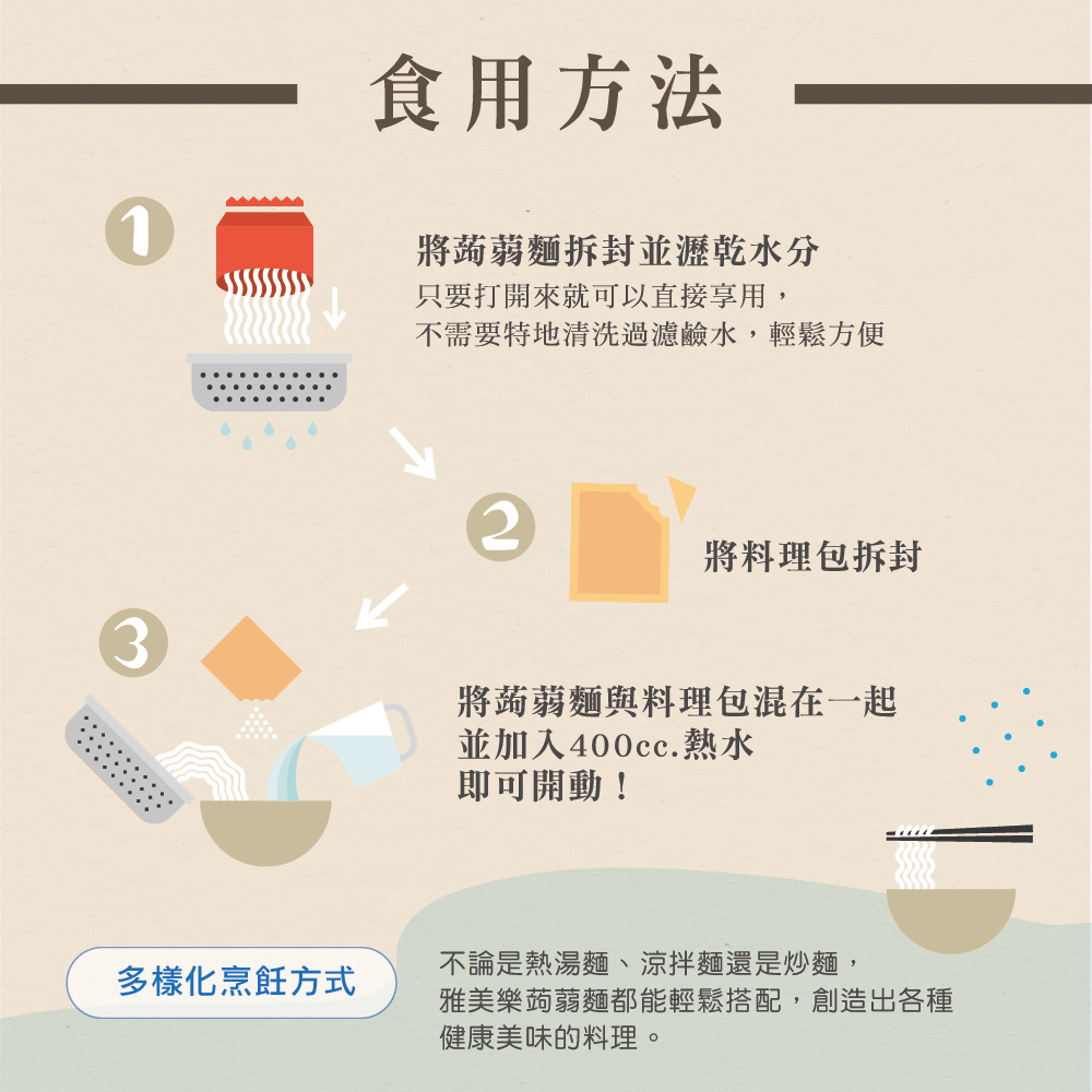 3.商品重(容)量:淨重:蒟蒻麵每份86公克(固形量60公克) 料理包每份30公克