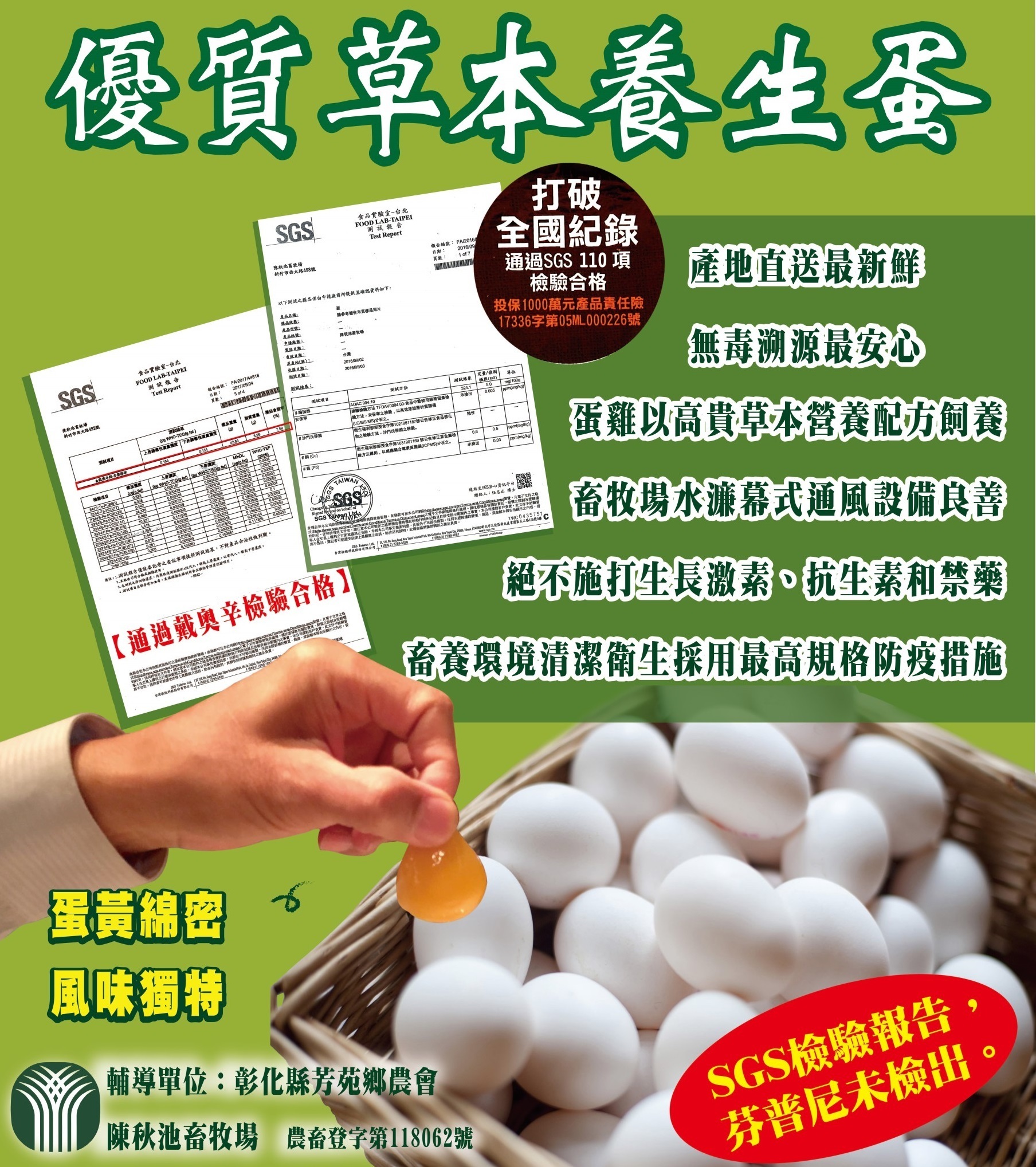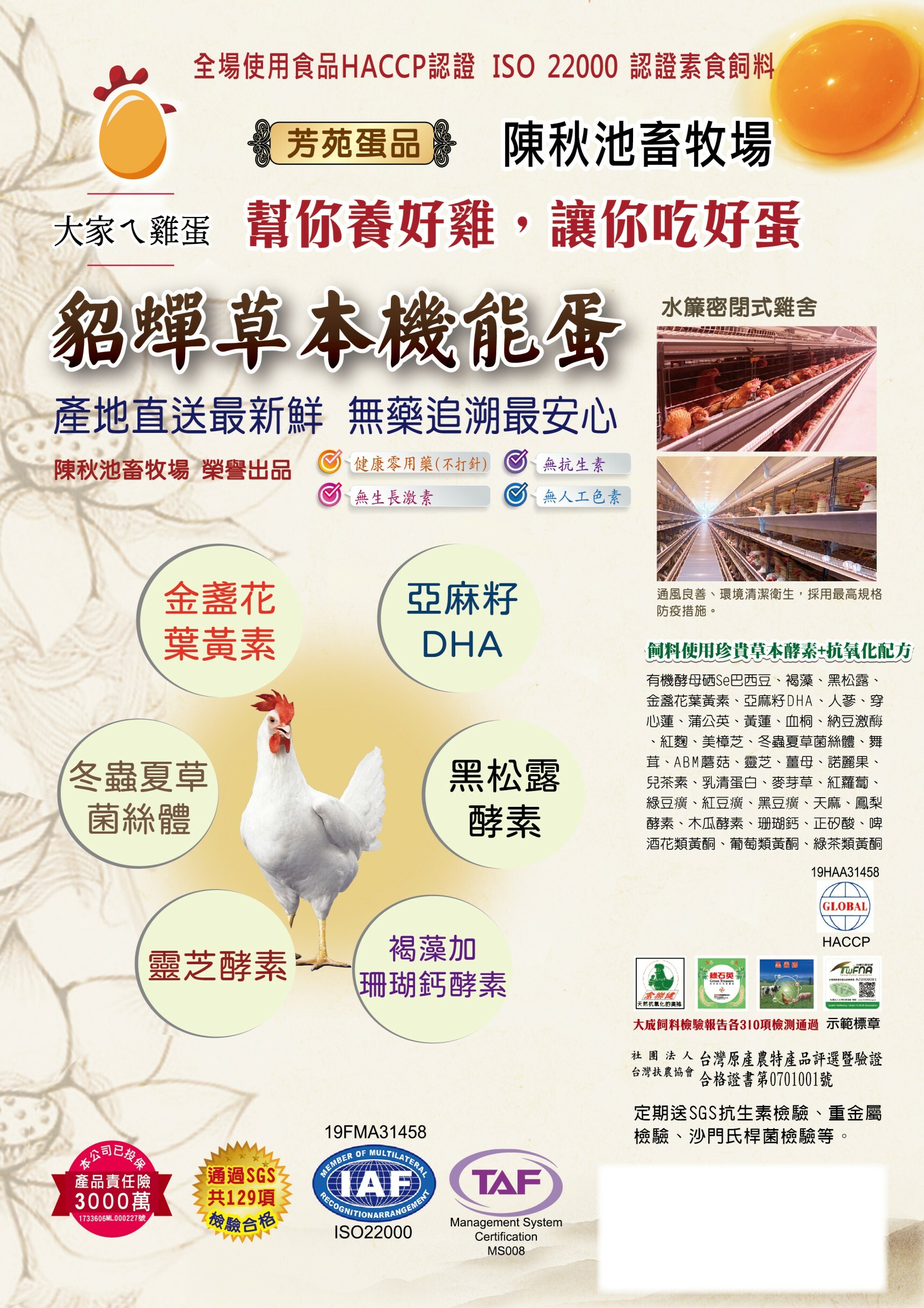 好吃的蛋不用調味,一入口,味蕾就告訴你好吃! 養雞的方式決定雞蛋美味: 無塵式&自動化雞舍→草本食材健康飼養→科技洗檢→ISO22000→產品溯源 【採用先進『全自動電腦環控、密閉水簾雞舍』】 儘管還不是野放,但也已經是圈養界的星級飯店了,不僅通風良好,炎夏時節,也能維持舒適的28度,更重要的是,雞籠下方設輸送帶,雞糞完全不落地,馬上帶走,確保雞舍整潔外,也讓雞隻不會受到排泄物堆積所引起的免疫力下降或各種疾病。難怪該養雞場雞隻可以不靠藥物,也不會有沙門氏桿菌的困擾。 【環境好,吃得好,不用藥】 因為環境管理的很好,因此雞隻免疫力強,就不需要施打抗生素,因為吃的是很好的草本配方飼料因此不需要生長激素與禁藥,雞隻活得好,自然下的蛋就好。而且會自主定期將剛下的蛋採樣送檢,以時時確保都是好蛋。 ★健康零用藥(不打針) ★無生長激素 ★無抗生素 ★無人工色素 製造廠商:陳秋池畜牧場 榮譽出品。 【六星級飼養環境】 全自動密閉水濂系統 控溫通風、環境清潔舒適 高品質飼養規格,杜絕污染源【新聞專題報導】蛋‧願人長久 通過SGS 戴奧辛、芬普尼等,共1050項檢驗合格,打破紀錄 檢驗報告詳細列表: HTTPS://PSE.IS/PSXGL 投保明台產物3000萬元產品責任險。 台灣扶農協會驗證合格證書第0701001號 無沙門氏桿菌、無大腸桿菌、無黃麴毒素、無重金屬、無藥物殘留。 蛋黃不添加人工色素,蛋黃綿密,高貴香氣,無腥味風味獨特。 Q:保存期限? A:室溫25度約5天,冷藏4~6度 60天 雞蛋盡量存放於冰箱內側確保溫度變動小以利保存,冰箱門邊開關溫差變動大。 牧場名稱:陳秋池畜牧場 負責人:陳秋池 牧場地址:彰化縣芳苑鄉草湖村二溪路三段509巷195弄建187 洗選場址:彰化縣芳苑鄉草湖村二溪路三段509巷195弄建187 場地面積:4,000坪 飼養規模:300,000隻雞 洗選間:彰化縣芳苑鄉草湖村二溪路三段509巷195弄建187 牧場登記證:農畜牧登字第 121823 號 |
