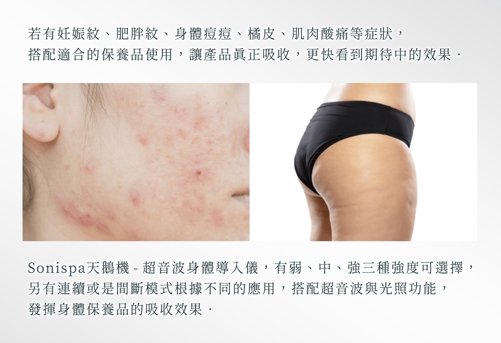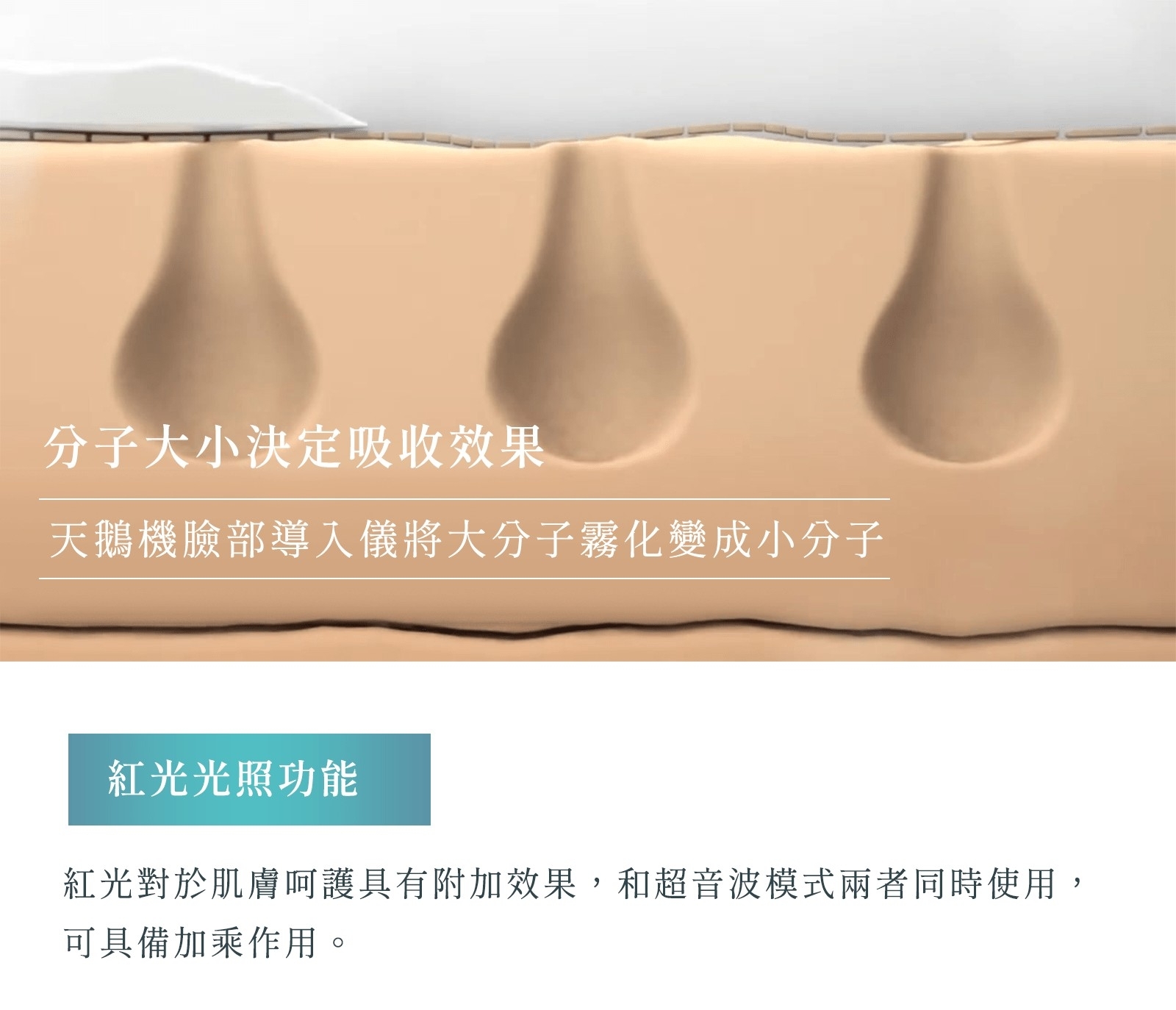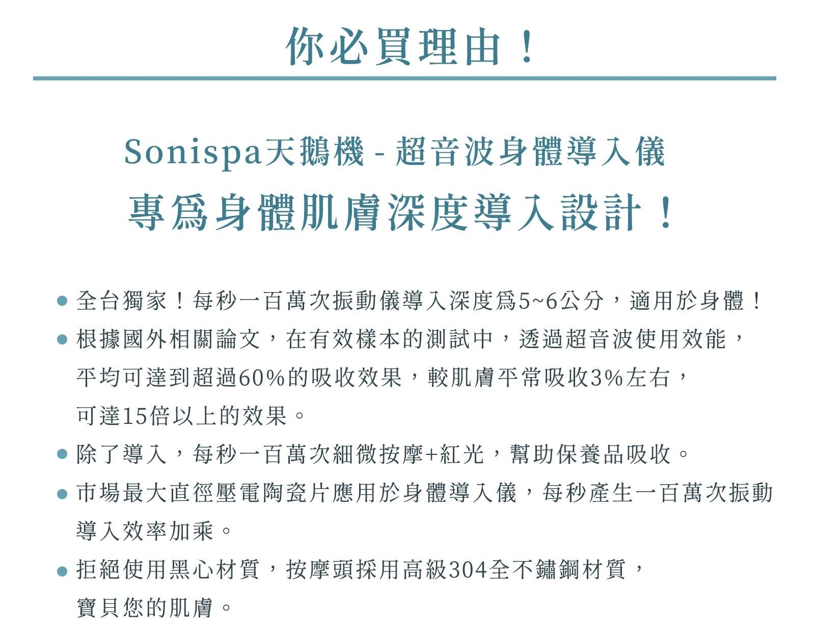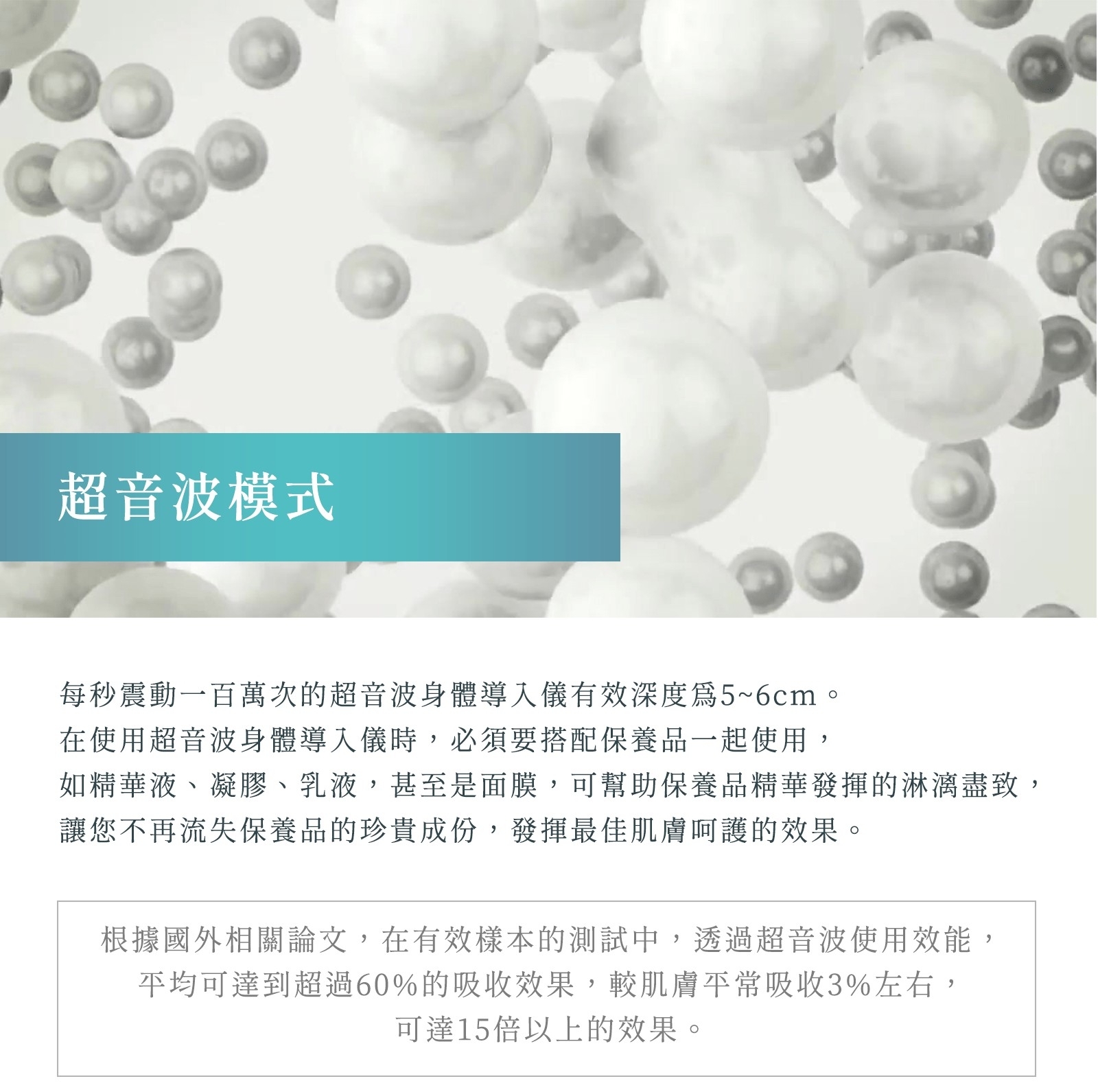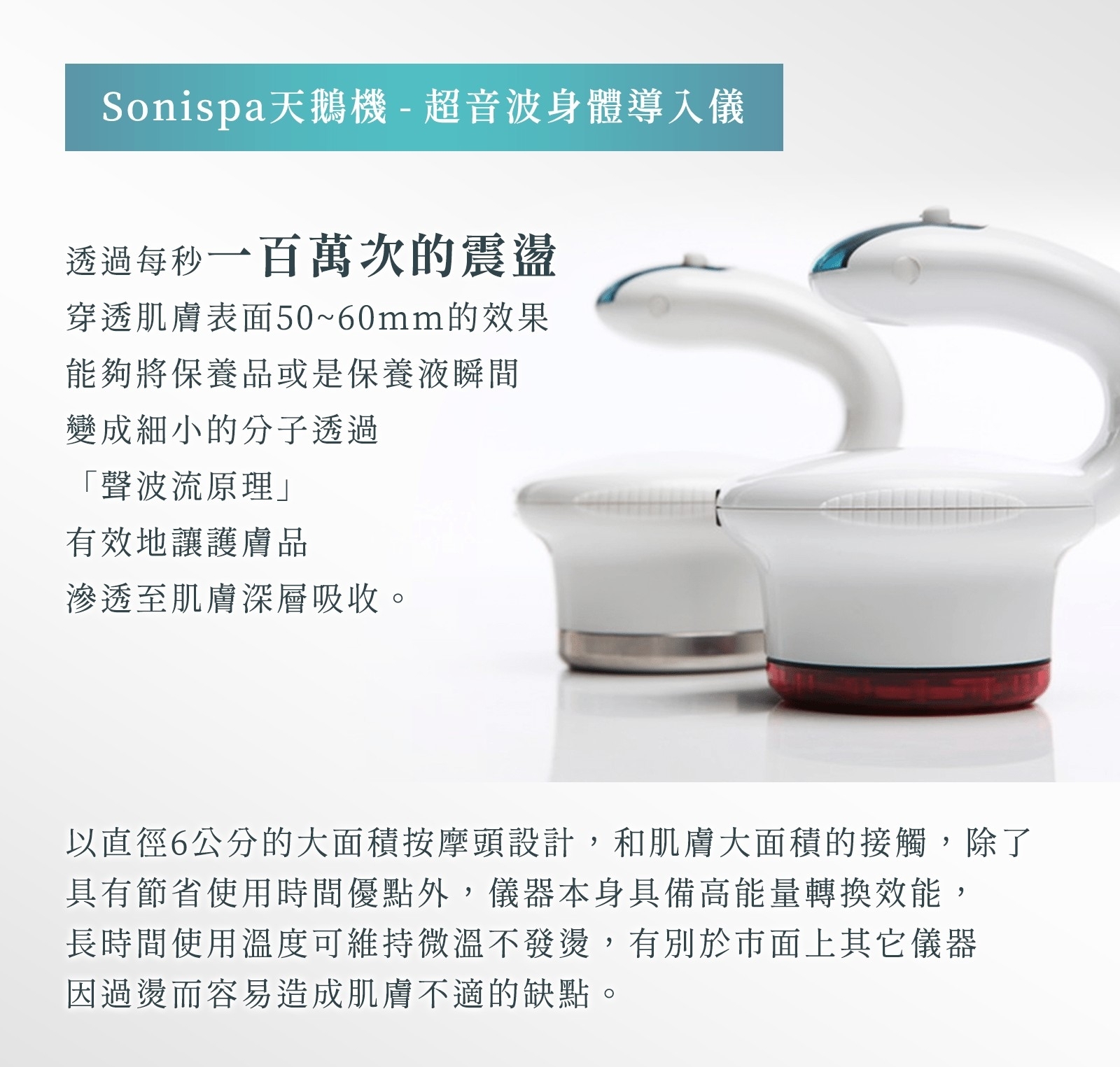 透過每秒一百萬次震盪,深入身體肌膚4-6公分,使保養品有效地儘速體部肌膚
