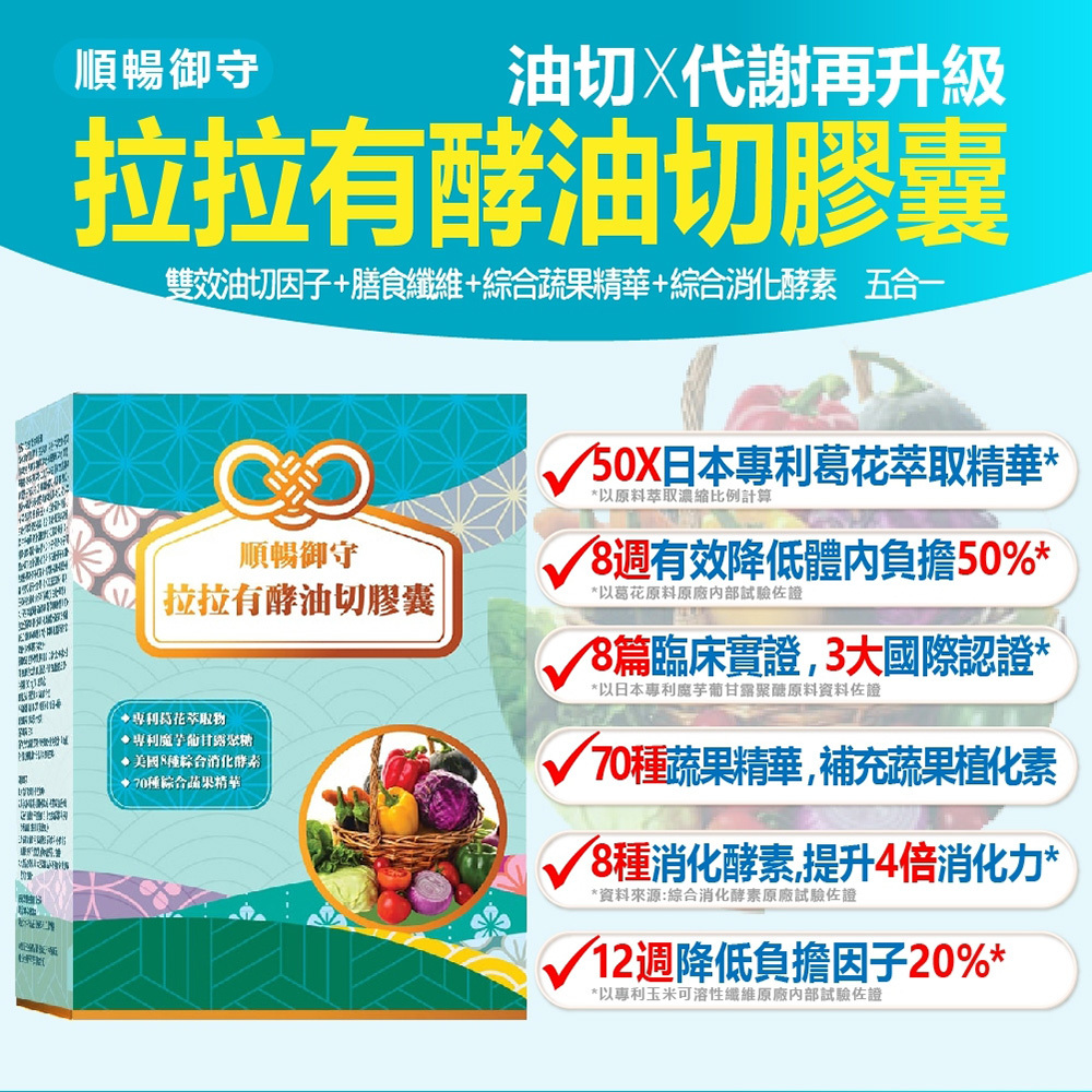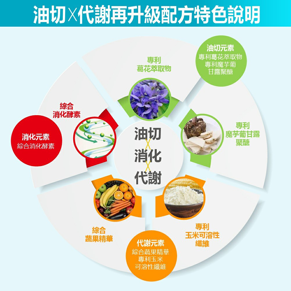 1.雙效油切因子+膳食纖維+綜合蔬果精華+綜合消化酵素 五合一順暢組合,雙油切專利與人體臨床試驗佐證,有效油切X代謝X消化,速效順暢無負擔。