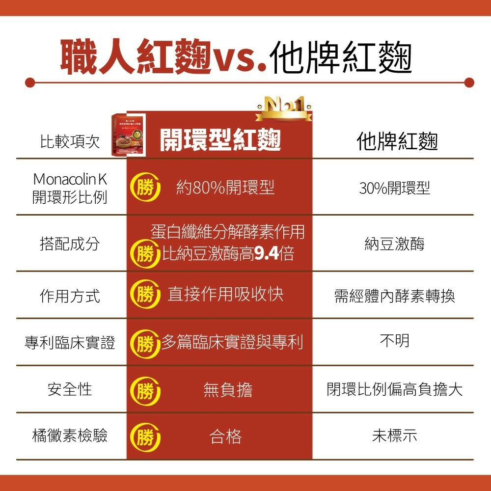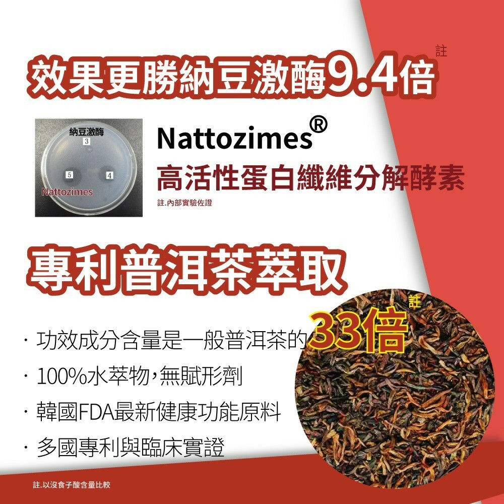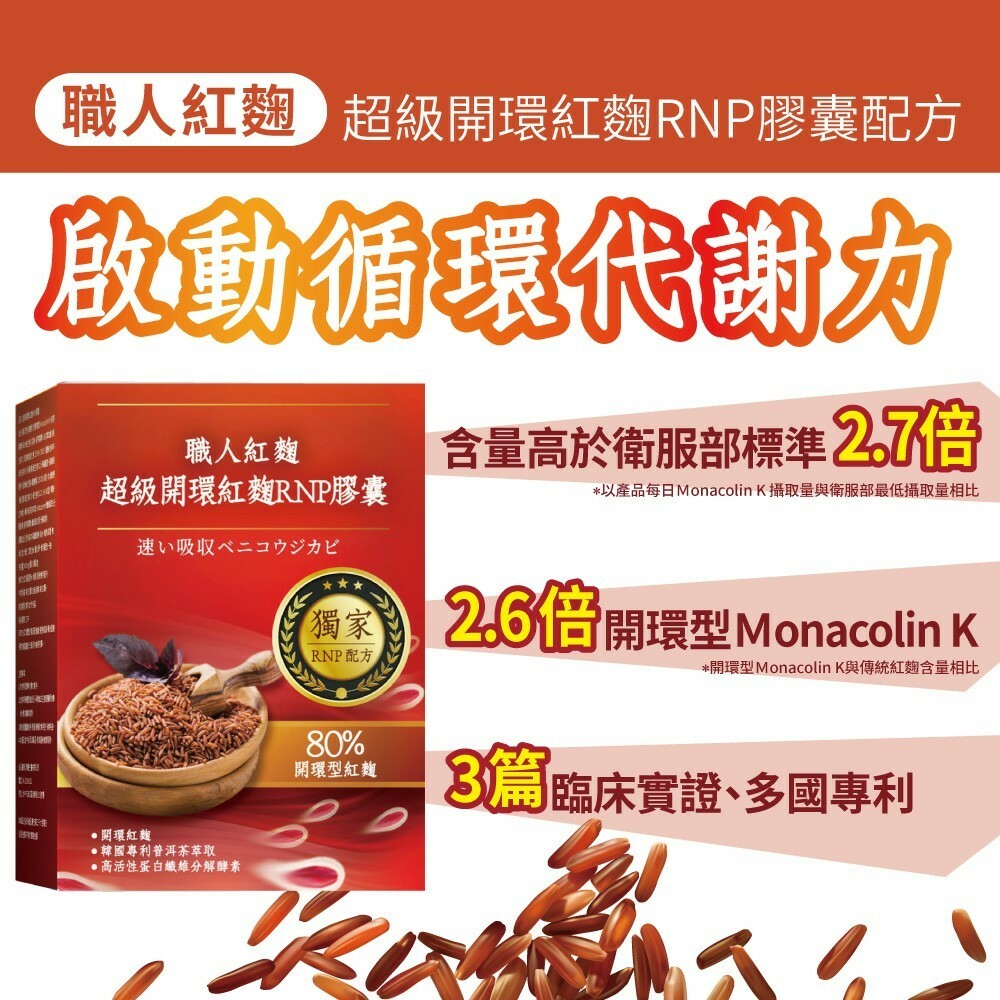1.獨家RNP配方,嚴選速效開還紅麴(R)+高活性蛋白纖維分解酵素(N)+韓國專利普洱茶萃取(P),效果加成。