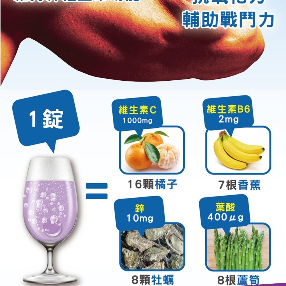 3.一錠=16顆橘子(c1000)、7根香蕉(維生素B6)、8顆牡蠣(鋅)、8根蘆筍(葉酸)