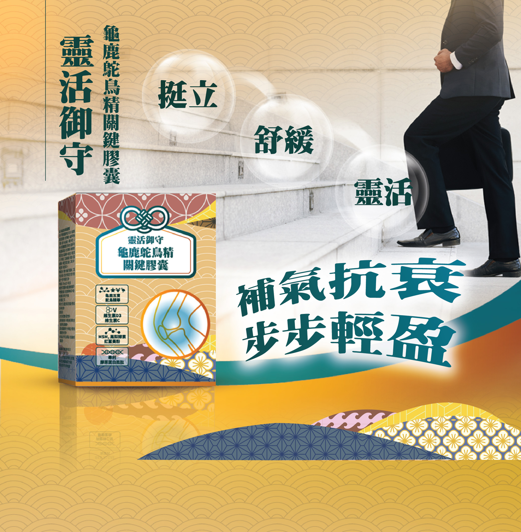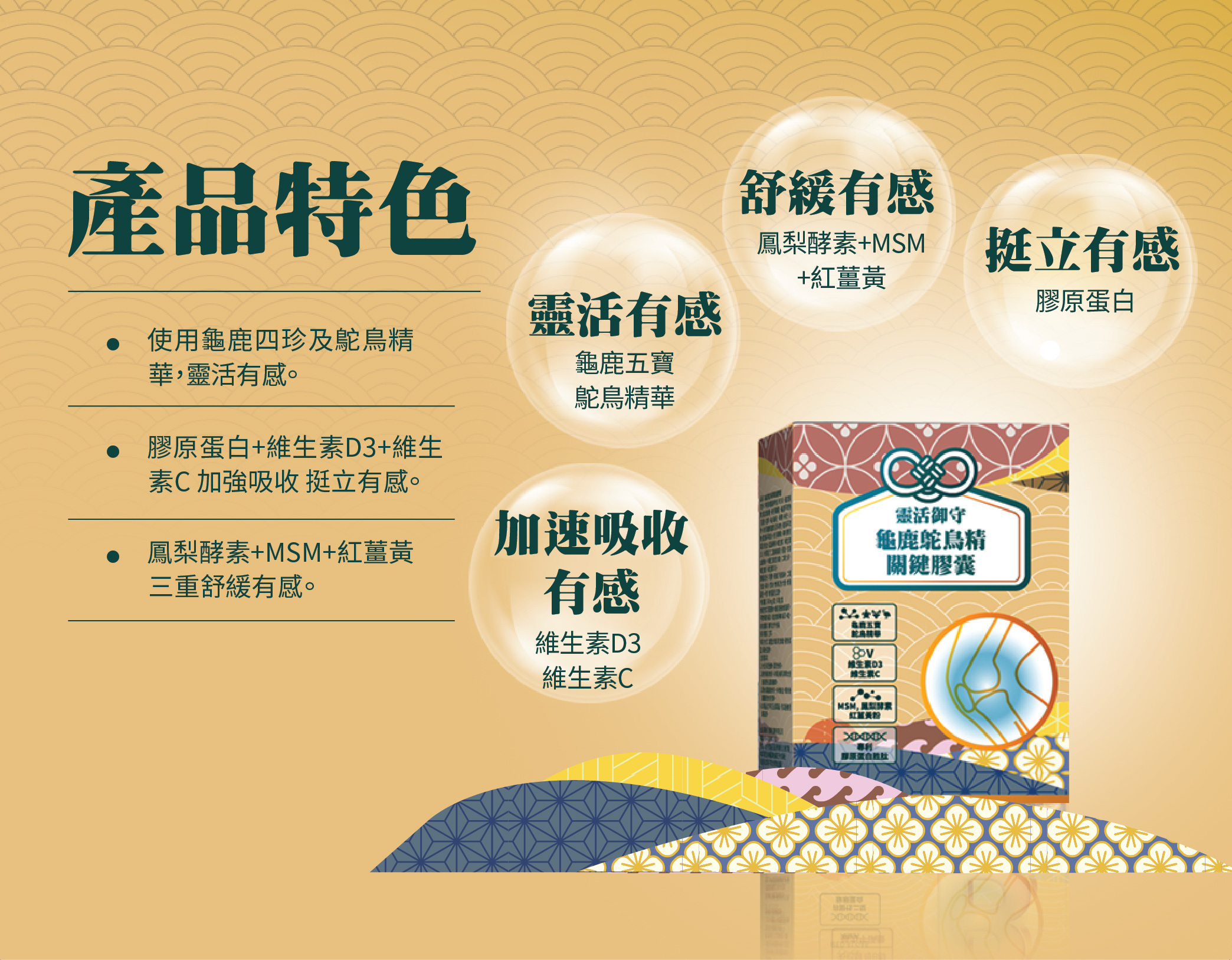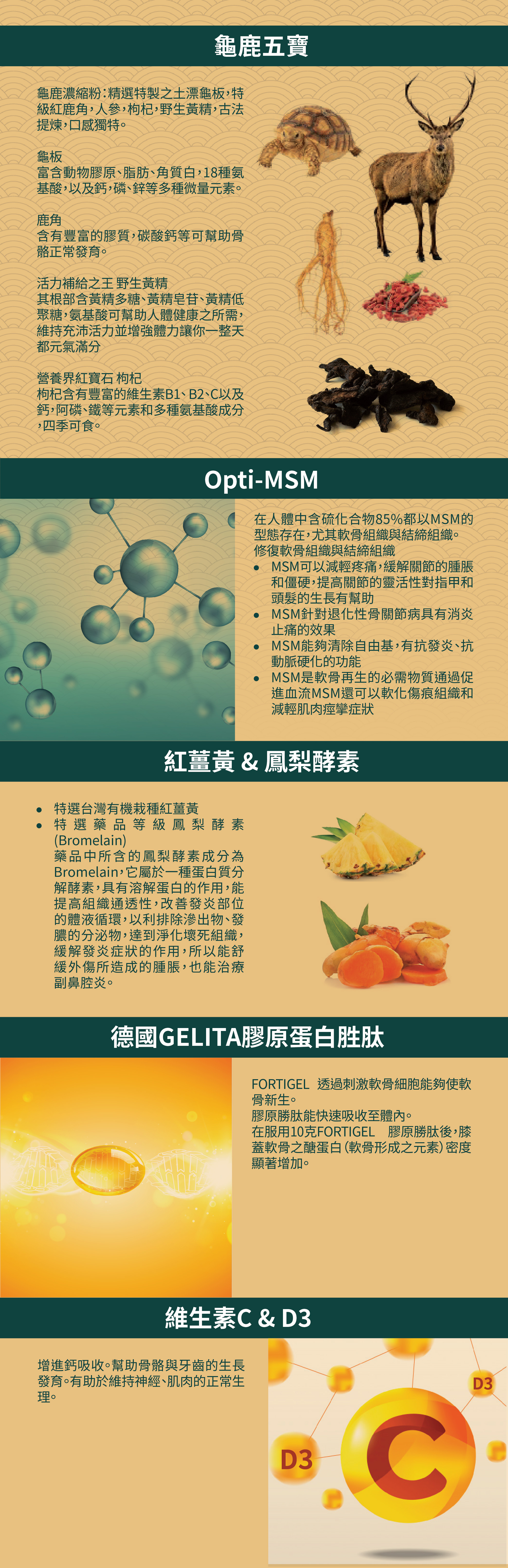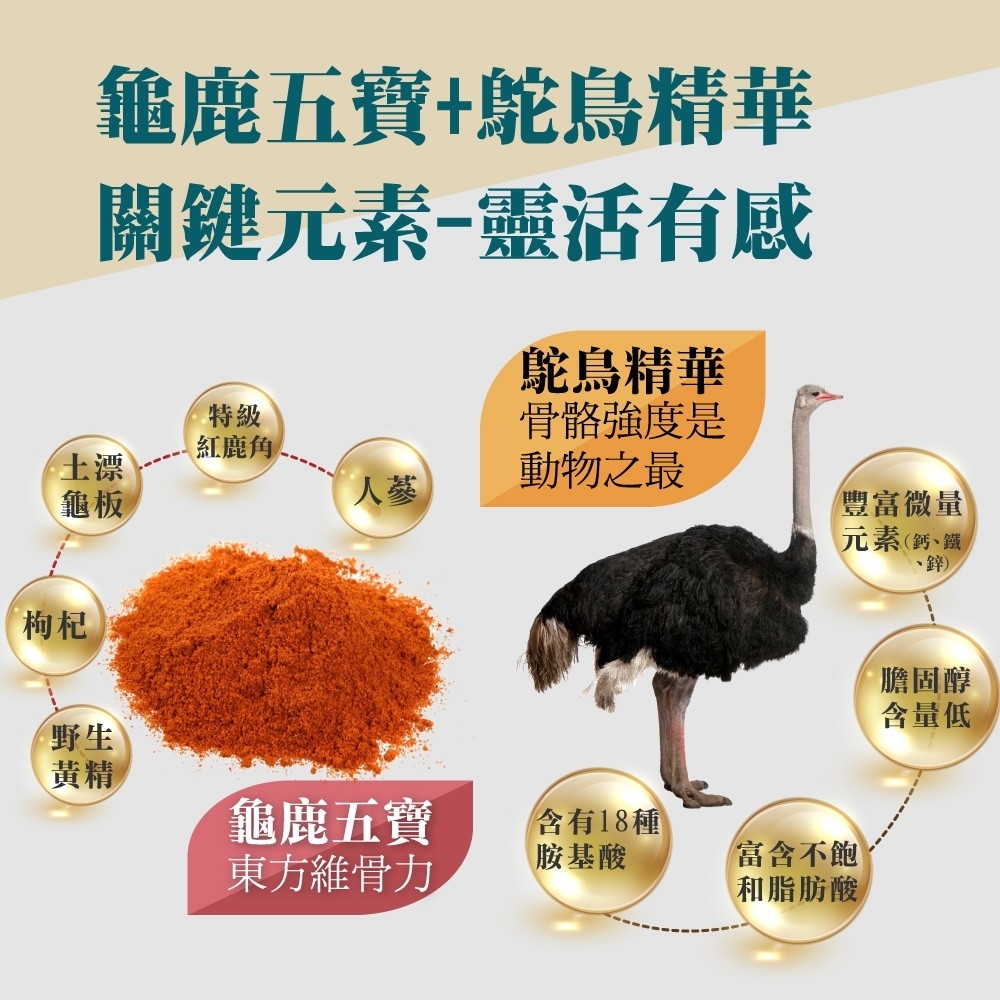 1.特選龜鹿五寶及鴕鳥精華,雙重固本靈活元素,靈活加倍有感。