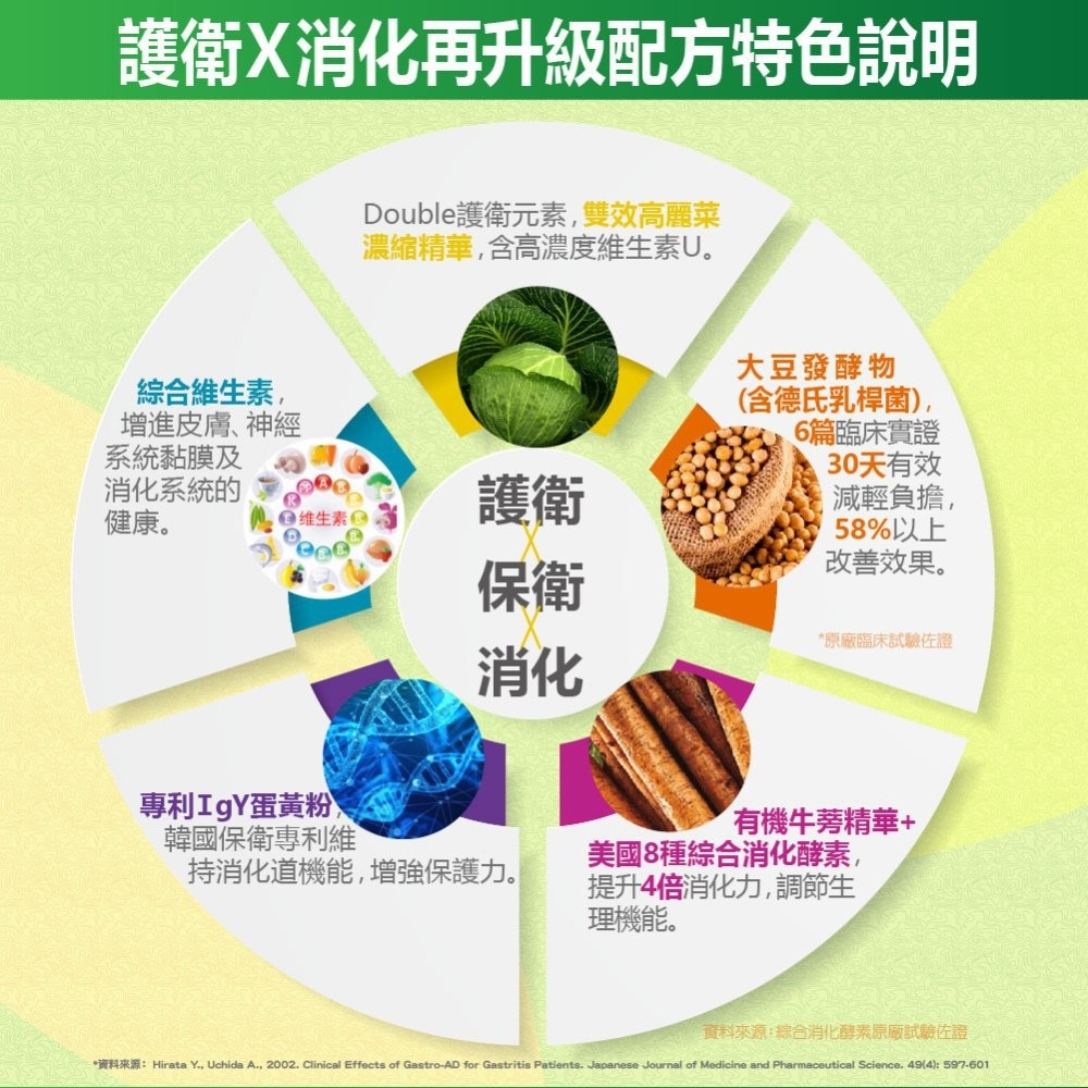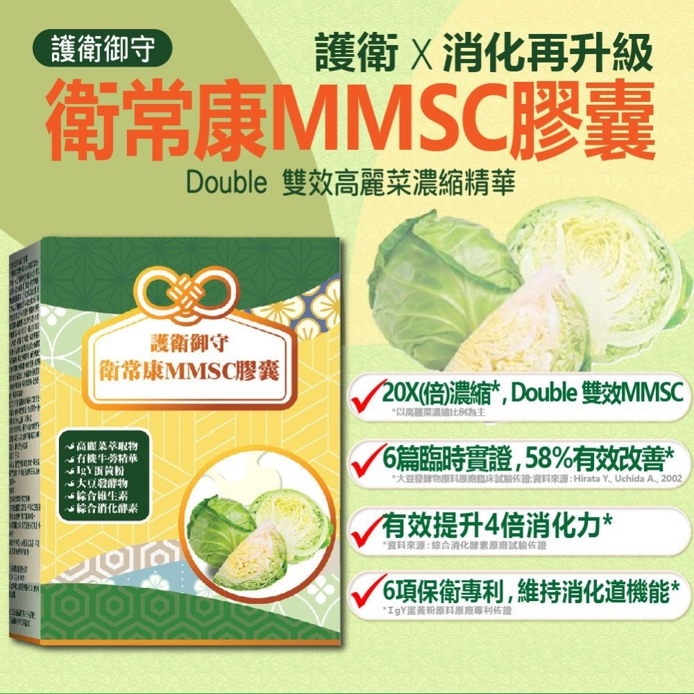 1.衛常康MMSC膠囊使用Double 雙效高麗菜濃縮精華+大豆發酵物+有機牛蒡精華+蛋黃粉+綜合消化酵素+綜合維生素7效組合,韓國保衛專利與人體臨床試驗佐證,有效護衛X保衛X消化,速效防護無負擔。