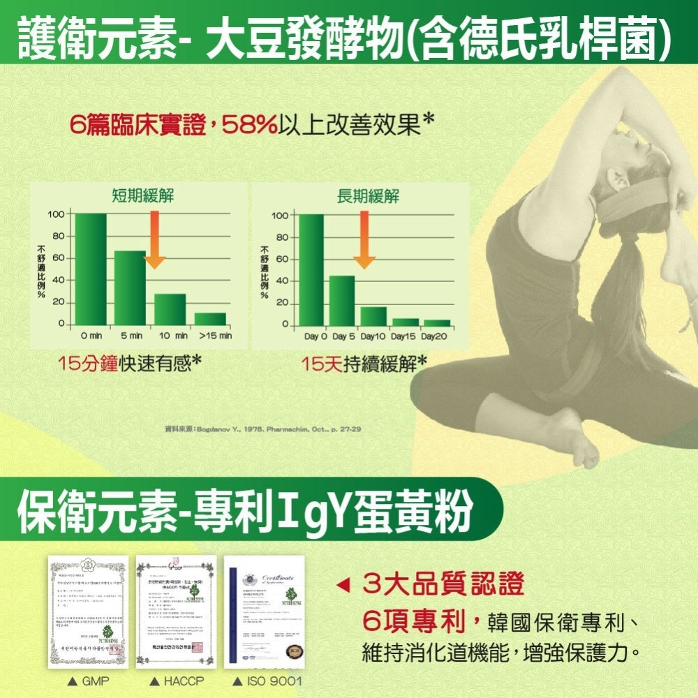 3.大豆發酵物,6篇臨床護衛試驗佐證,15分鐘快速有感,15天持續緩解。