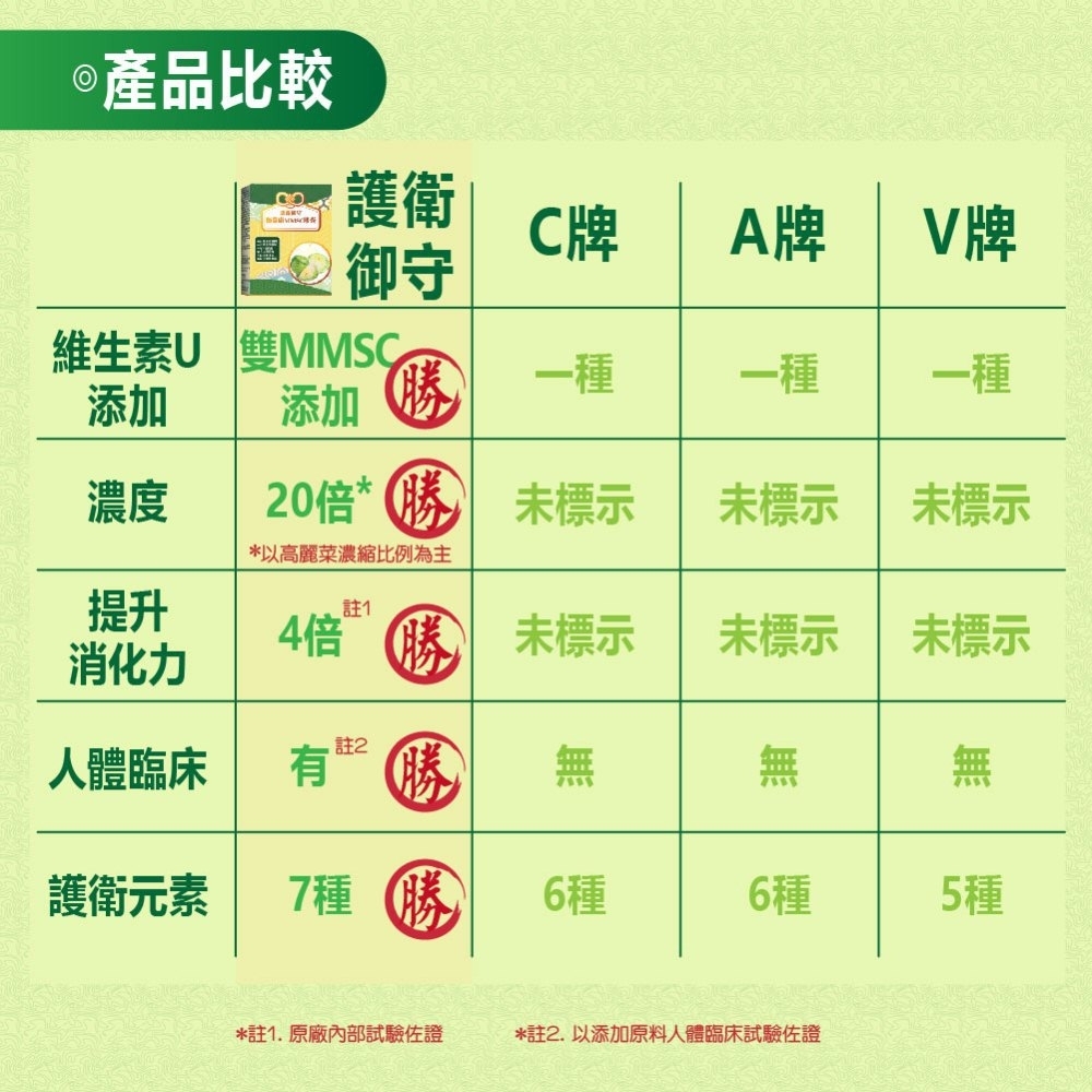 2.專利載體型高麗菜濃縮精華+20倍濃縮高麗菜萃取, Double 雙效MMSC,高濃度維生素U好吸收,護衛持續有感。