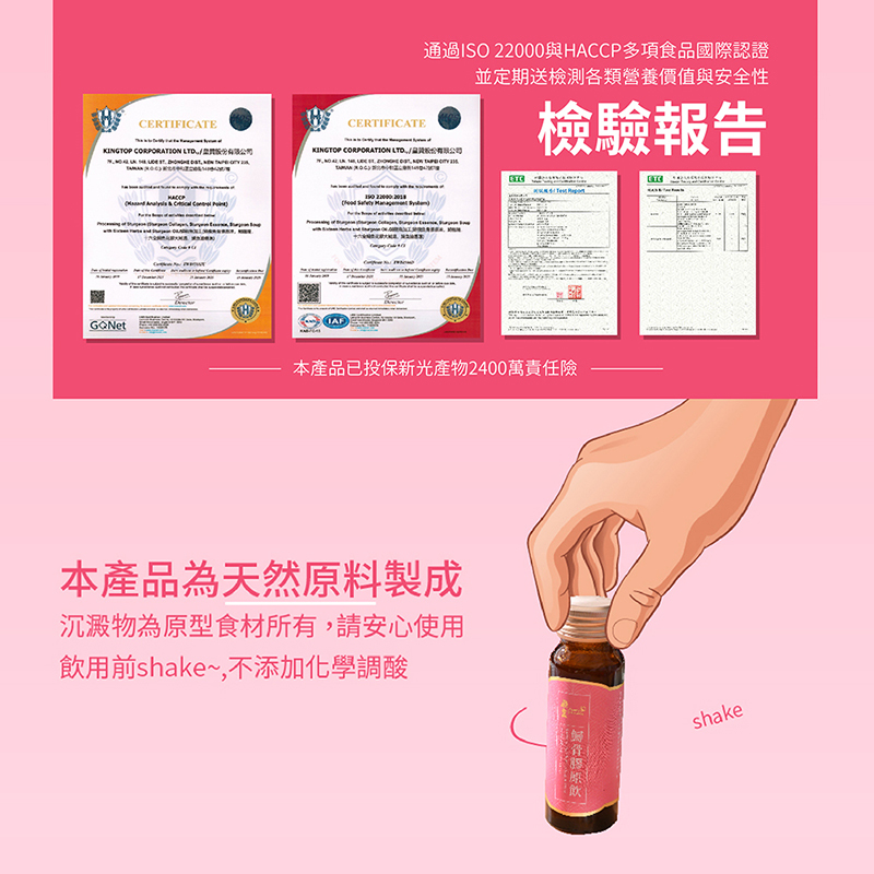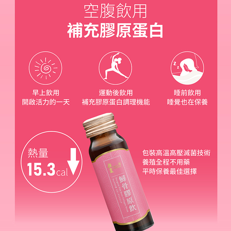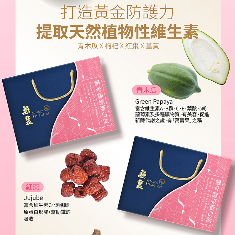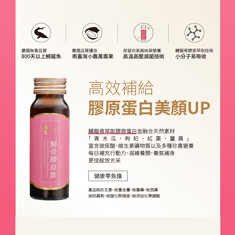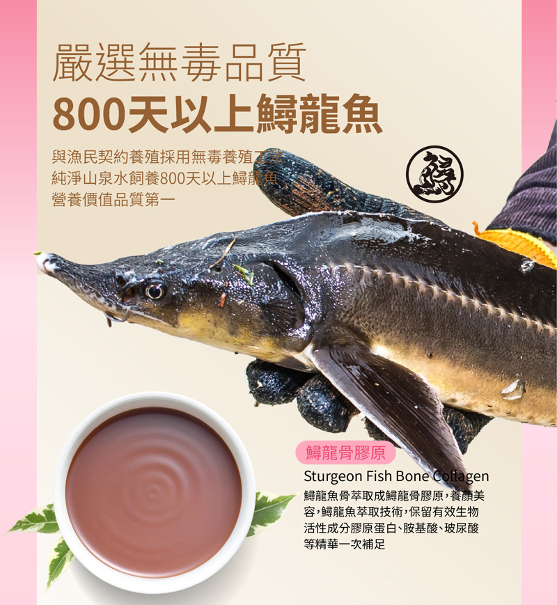 | 原型食材製成~~無抗生素、無重金屬、無農藥、無西藥 嚴選無毒品質-800天以上鱘龍魚 鱘龍魚骨萃取成鱘龍骨膠原,養顏美容, 鱘龍魚萃取技術,保留有效生物活性成分 膠原蛋白、胺基酸、玻尿酸等精華一次補足 高效補給 膠原蛋白美顏UP 鱘龍骨萃取膠原蛋白並融合天然素材「青木瓜、枸杞、紅棗、薑黃」富含玻尿酸、維生素礦物質以及多種珍貴營養 每日補充行動力、滋補養顏、養氣補身 更佳綻放光采 天然食補 從內而外享受美麗和滋養 獨特淬工法將鱘龍骨的營養精華完整保留,滴滴精純 鎖住膠原蛋白精華,煥發健康光澤 健康零負擔 無抗生素、無重金屬、無農藥、無西藥 無防腐劑、無塑化劑殘留、無添加化學調酸 |