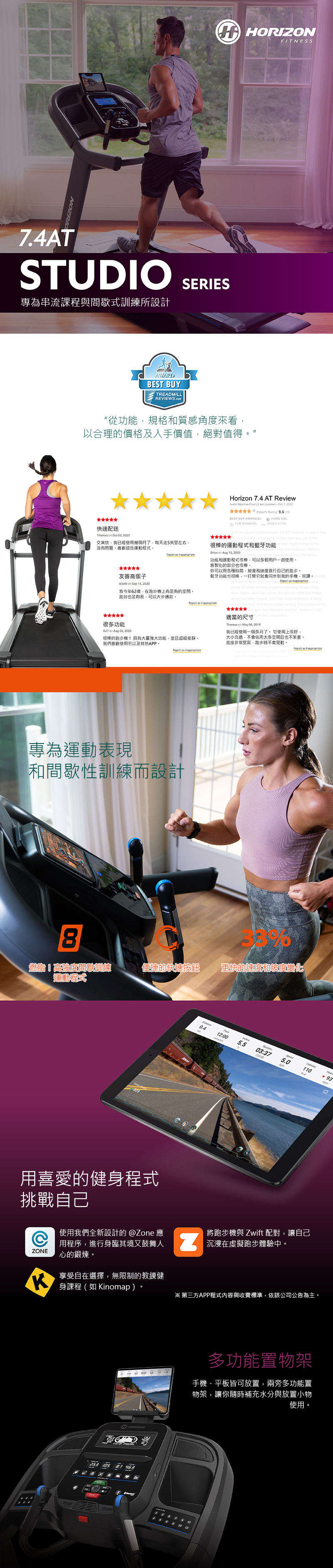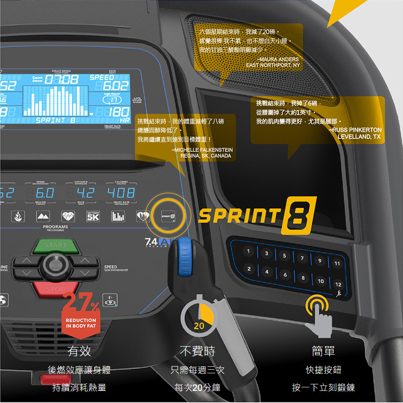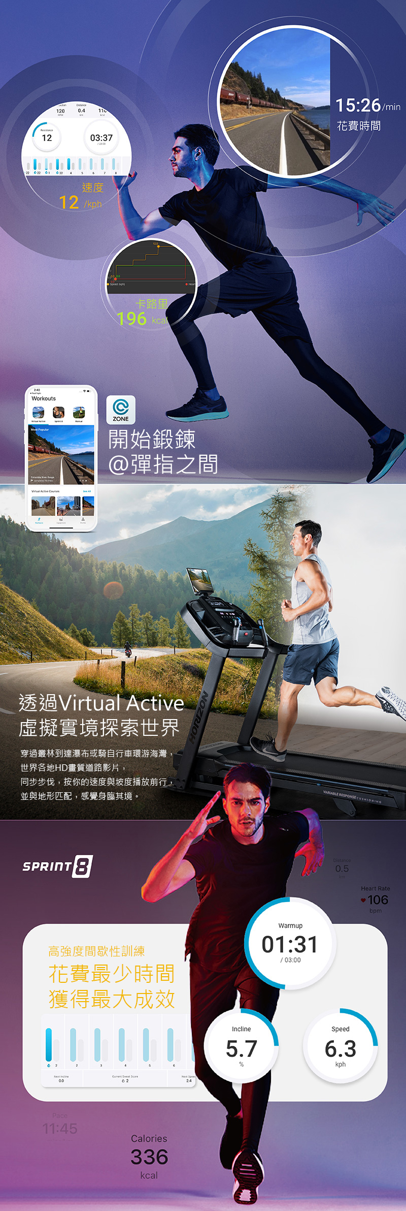 運動程式 10組,手動、爬坡、初次5K體驗、燃脂、自訂、目標距離、目標卡路里、目標心率、自訂心率、Sprint 8高強度間歇訓練