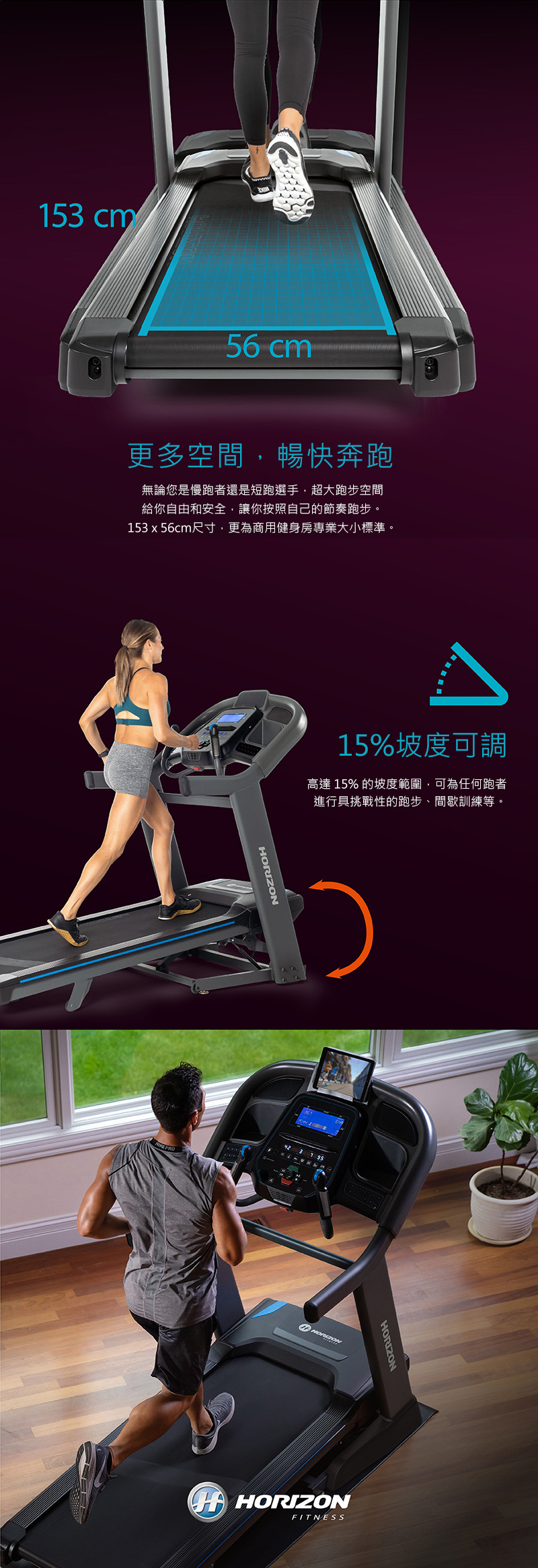 ★153x56cm的寬大跑帶面積提供足夠跑步空間