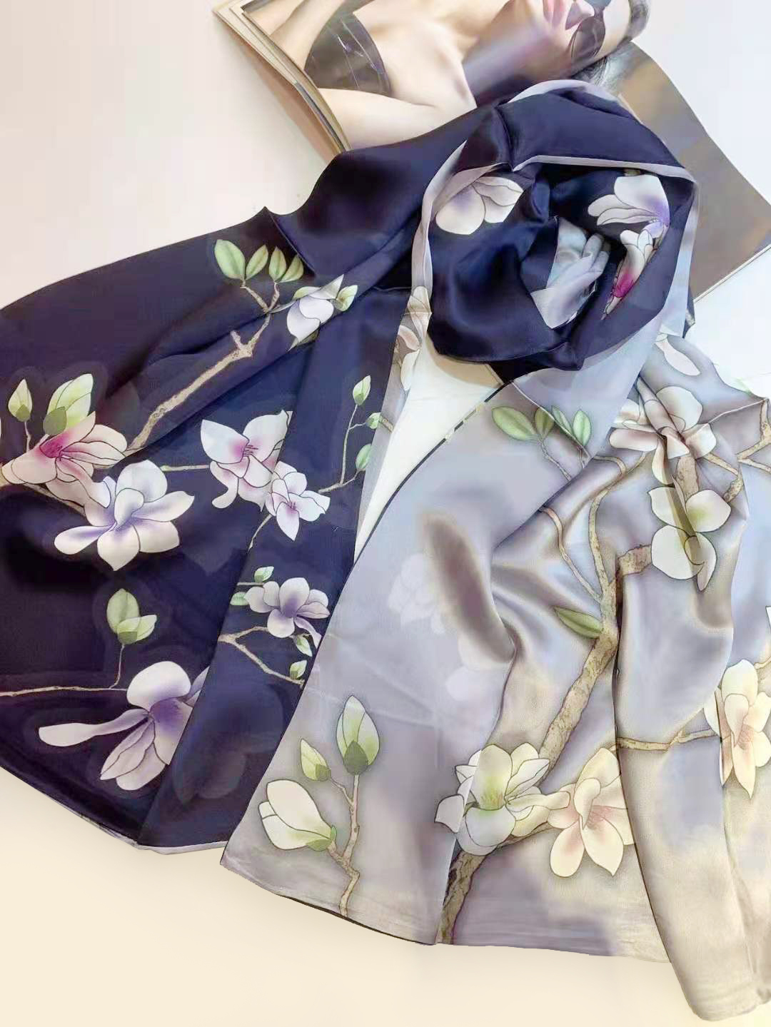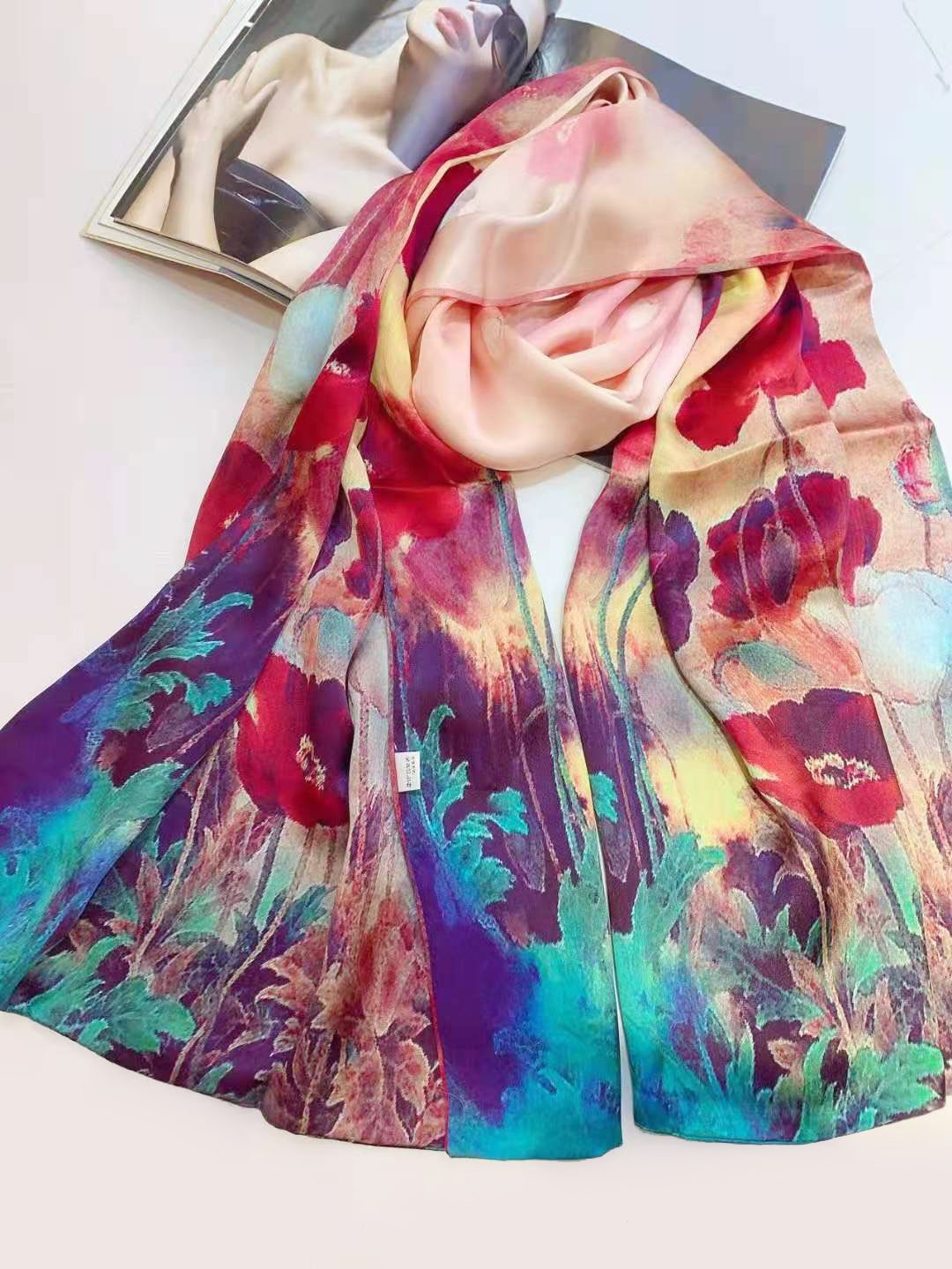 100%純蠶絲、雙層數位印花、手工捲邊