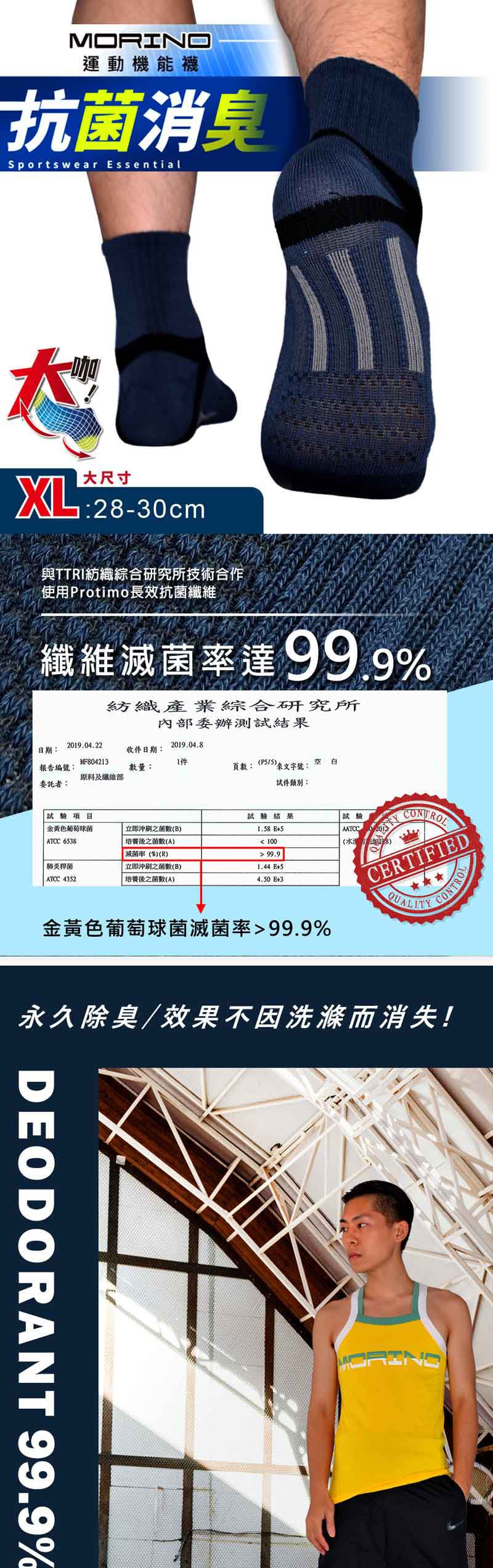 ◎與TTRI紡織綜合研究所技術合作,使用Protimo長效抗菌纖維,有效抑制細菌 孳生,防止異味產生。