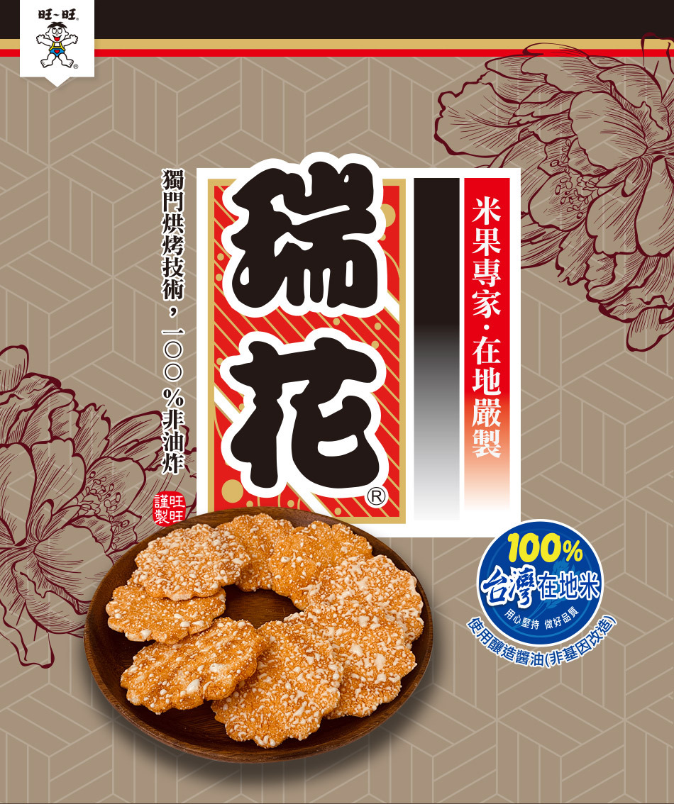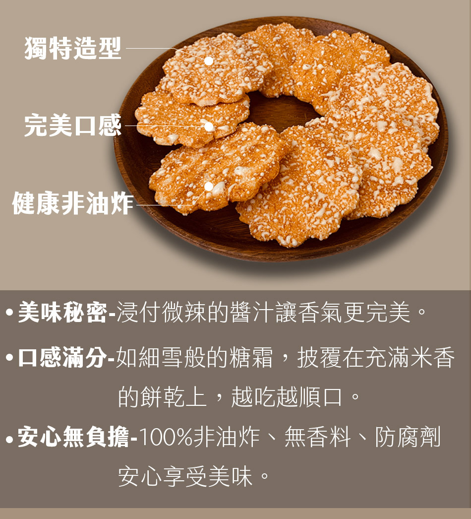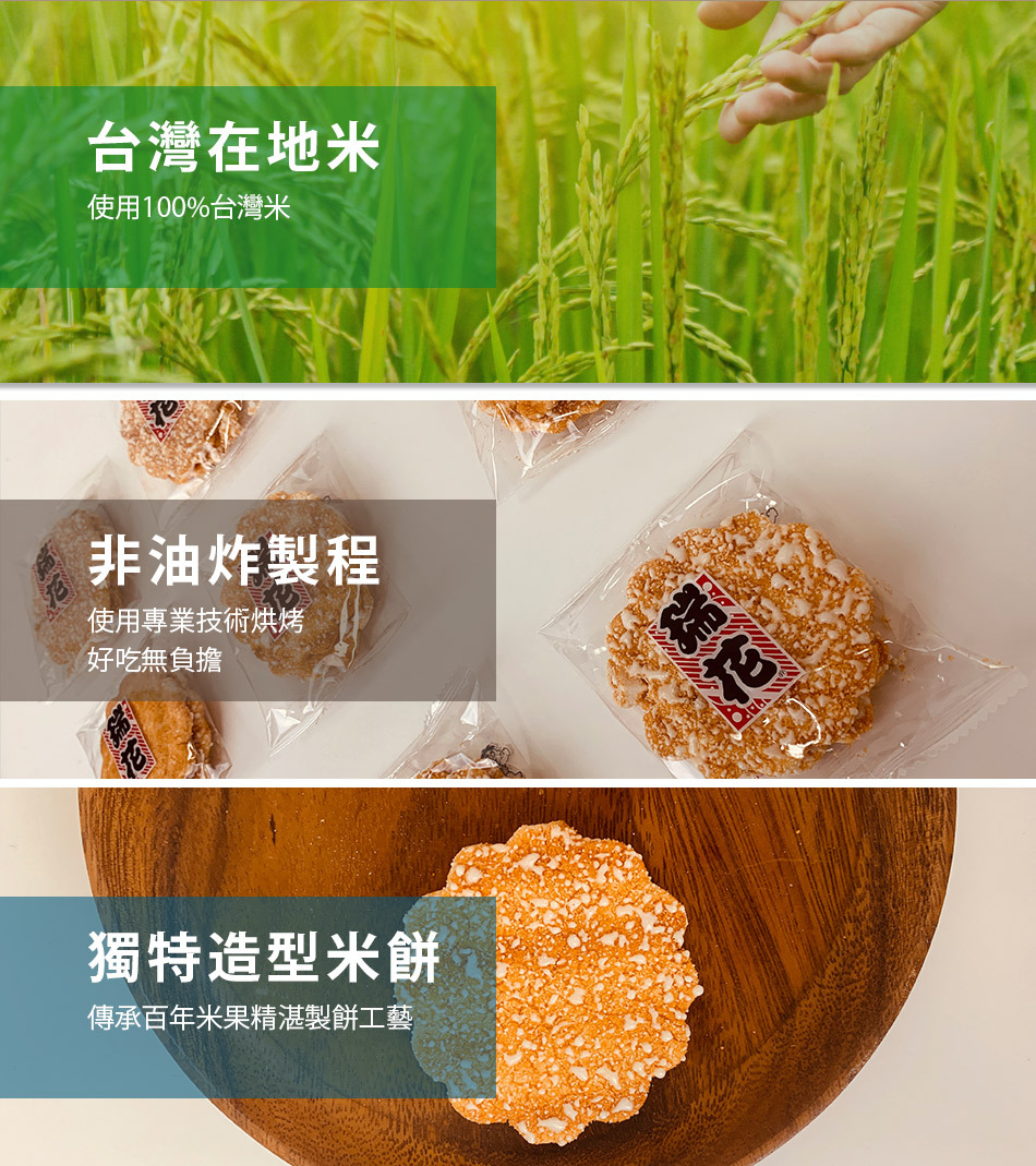 • 以100%產自台灣的精選稻米搭配五十年製餅工藝製成。