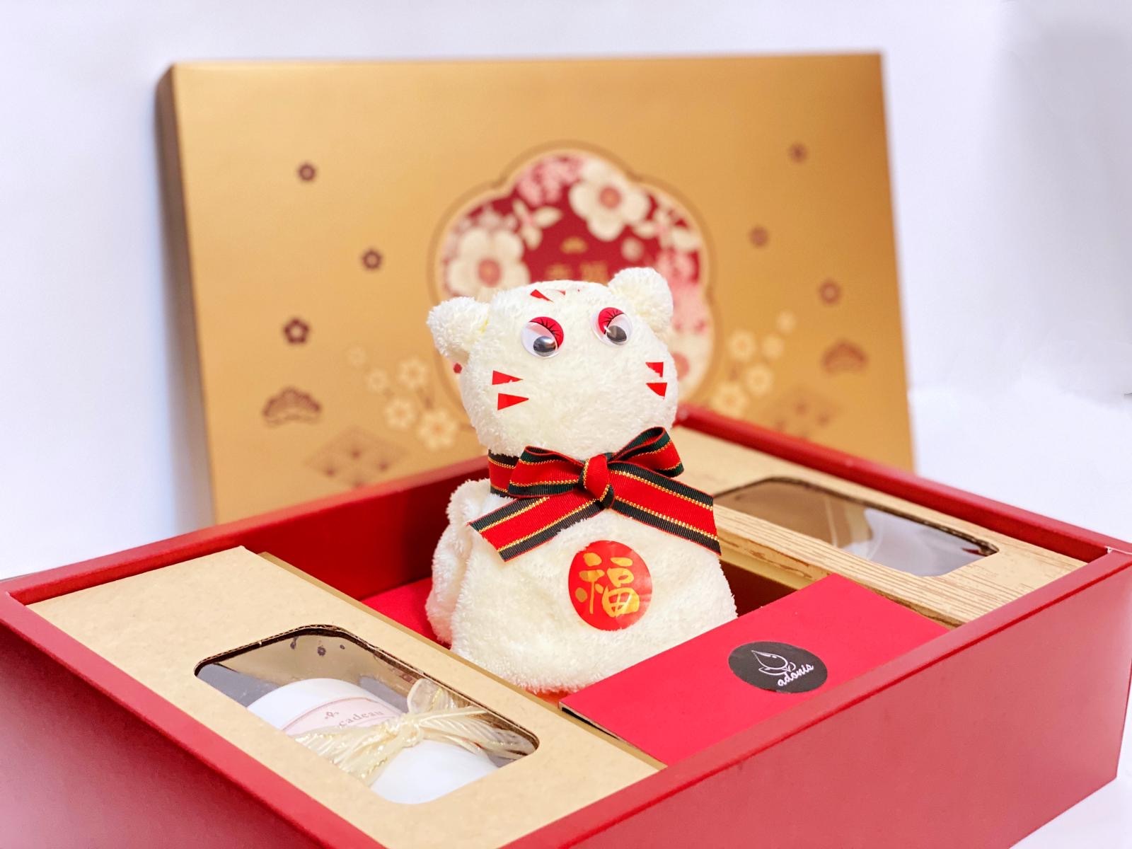 【內容物】:阿多尼斯香頌小蒼蘭擴香100ml*1,阿多尼斯柔雅白麝香香氛蠟燭200ml*1,吉祥金虎造型毛巾*1。