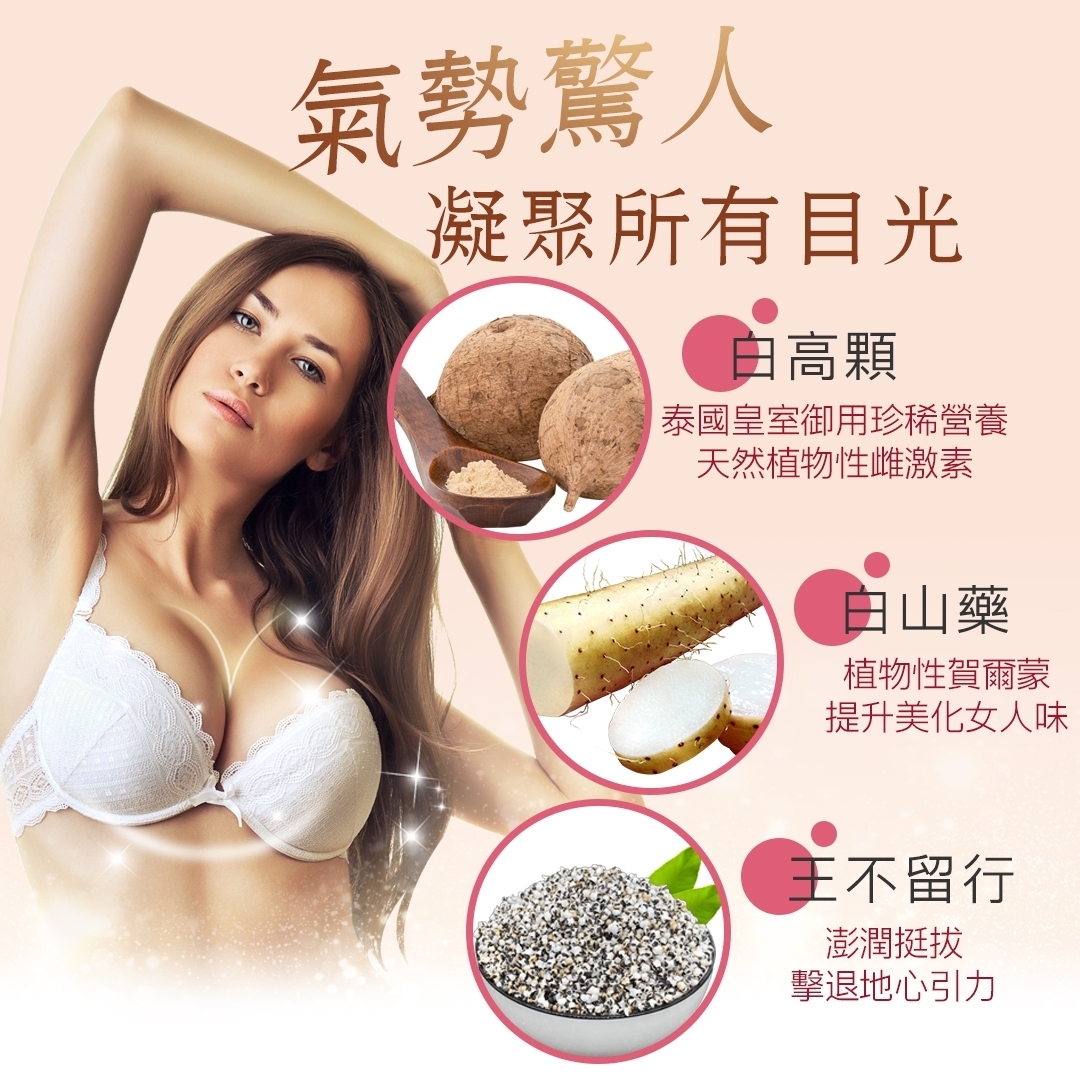 成 份:麥芽糊精、大豆卵磷脂(大豆磷脂質)、泰國白高顆萃取、白山藥萃取、王不留行萃取物、青木瓜萃取物、大豆萃取物(含大豆異黃酮)、酵母萃取粉(含彈力蛋白)、日本專利流行鏈球菌發酵物(含透明質酸鈉≧95%)