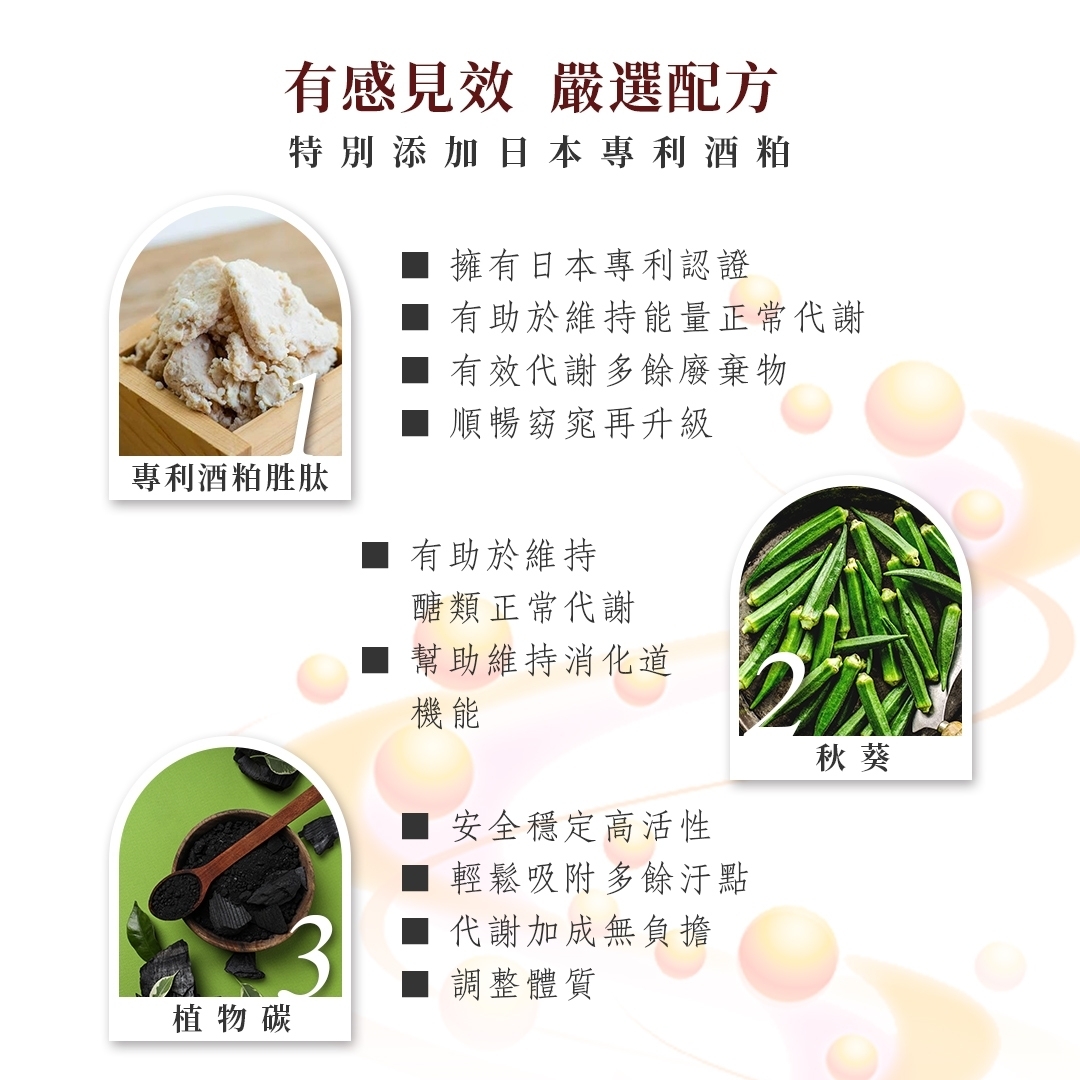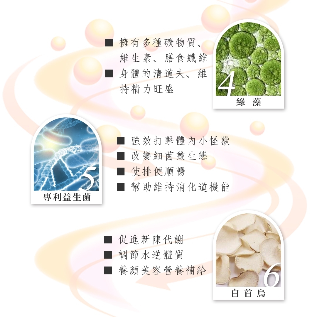 成 份:綠藻粉、麥芽糊精、70種蔬果酵素 (綜合蔬果酵素粉(白蘿蔔、胡蘿蔔、山藥、山芹菜、蕹菜、青花菜、芹菜、芥菜、結球萵苣、劍葉萵苣、高麗菜、半結球萵苣、球莖甘藍、茄子、青椒、小黃瓜、花胡瓜、南瓜、山苦瓜、茼萵、結球白菜、油菜、蚵白菜、長豇豆、扁蒲、紅鳳菜、玉米筍、青辣椒、紫地瓜葉、綠地瓜葉、菠菜、野莧菜、牛蕃茄、秋葵、紅甘薯、冬瓜、大心菜、甜菜根、紫高麗菜、生薑、甜瓜、西瓜、青木瓜、哈蜜瓜、洋香瓜、蕃茄、鳳梨、葡萄柚、柳橙、柑橘、茂谷柑、番石榴、葡萄、香蕉、波蘿蜜、火龍果、日本蜜柑、青梅、白葡萄、桑椹、蜜棗、檸檬、蜜梨、杏鮑菇、金針菇、鮑魚菇、香菇、黑木耳、胡蘿蔔葉、五葉松、咸豐草、石蓮花、仙人掌果、花生莖、淡竹葉、羅勒、辣木葉、破布子、枸杞、薄荷葉、香蘭、魚腥草、迷迭香、芫菜、芭樂葉、乳糖、玉米澱粉)、澱粉酵素、蛋白酵素、解脂酵素、諾麗果醱酵濃縮粉末、二氧化矽、砂糖、檸檬酸鈉、綜合水果濃縮汁(百香果、鳳梨、橘子、香蕉、蜜柑、芒果、木瓜、萊姆、檸檬、蘋果、白葡萄、水蜜桃、藍莓、西印度櫻桃、紅葡萄、奇異果))、大豆卵磷脂、活性竹炭粉、秋葵粉(秋葵萃取物、菊糖)、多種複合乳酸菌粉(乳糖、乳酸乳球菌、植物乳桿菌、鼠李糖乳桿菌、副乾酪乳桿菌、唾液乳桿菌、嗜酸性乳桿菌、保加利亞桿菌、乾酪乳桿菌、加氏乳桿菌、短桿乳桿菌、雙叉雙歧桿菌、長雙歧桿菌、脫脂奶粉、檸檬酸、維生素C、木寡糖)、白首烏萃取物、微結晶狀α-纖維素、專利清酒酒粕、專利嗜酸乳桿菌
