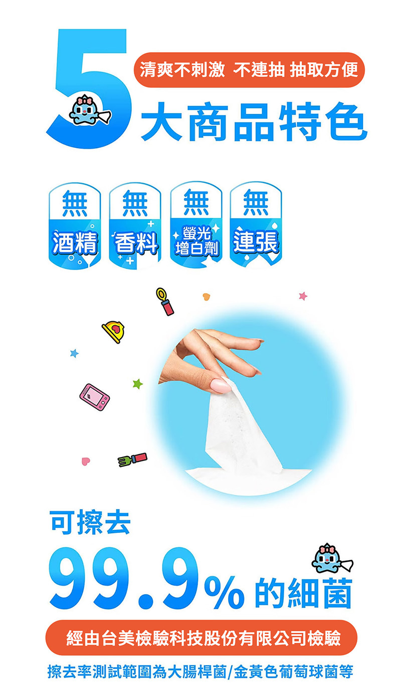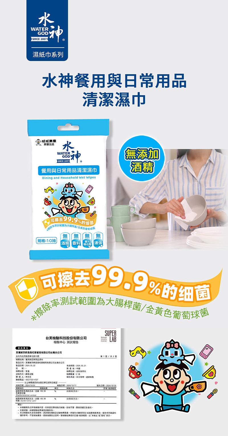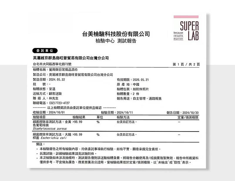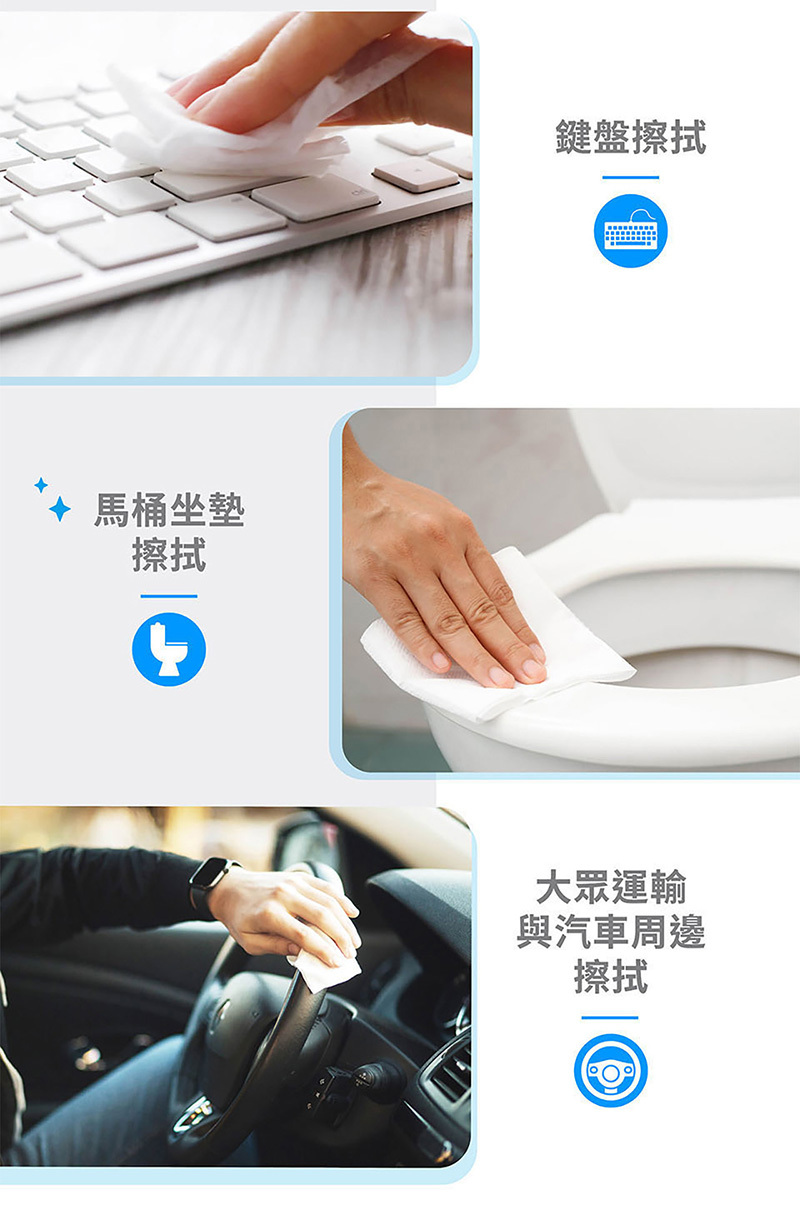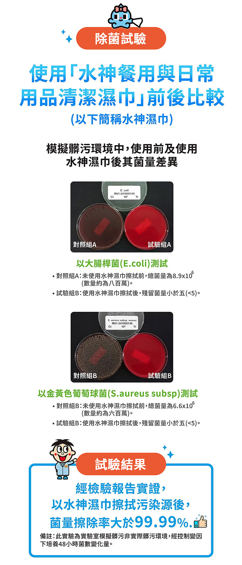 經第三方檢驗單位實證,可擦去99.9%的細菌,如:大腸桿菌與金黃色葡萄球菌…等。
