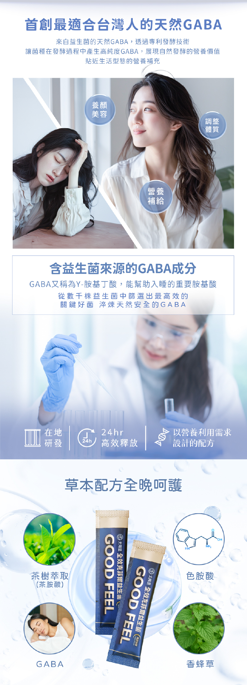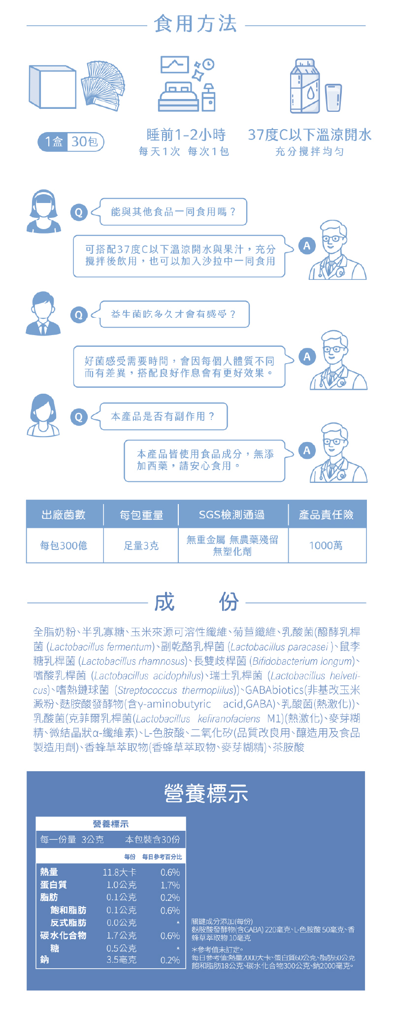 4.內容物成分:非基改玉米澱粉、半乳寡糖、菊苣纖維、全脂奶粉、乳酸菌(醱酵乳桿菌 (Lactobacillus fermentum)、副乾酪乳桿菌 (Lactobacillus paracasei )、鼠李糖乳桿菌 (Lactobacillus rhamnosus)、長雙歧桿菌 (Bifidobacterium longum)、嗜酸乳桿菌 (Lactobacillus acidophilus)、瑞士乳桿菌 (Lactobacillus helveticus)、嗜熱鏈球菌 (Streptococcus thermoplilus)、GABAbioticsTM(非基改玉米澱粉、麩胺酸發酵物(含 γ-aminobutyric acid,GABA)、乳酸菌(熱激化))、乳酸菌(克菲爾乳桿菌(Lactobacillus kefiranofaciens M1)(熱激化)、非基改玉米澱粉、微結晶狀α-纖維素)、L-色胺酸、二氧化矽(品質改良用、釀造用及食品製造用劑)、香蜂草萃取物(香蜂草萃取物、麥芽糊精)、茶胺酸