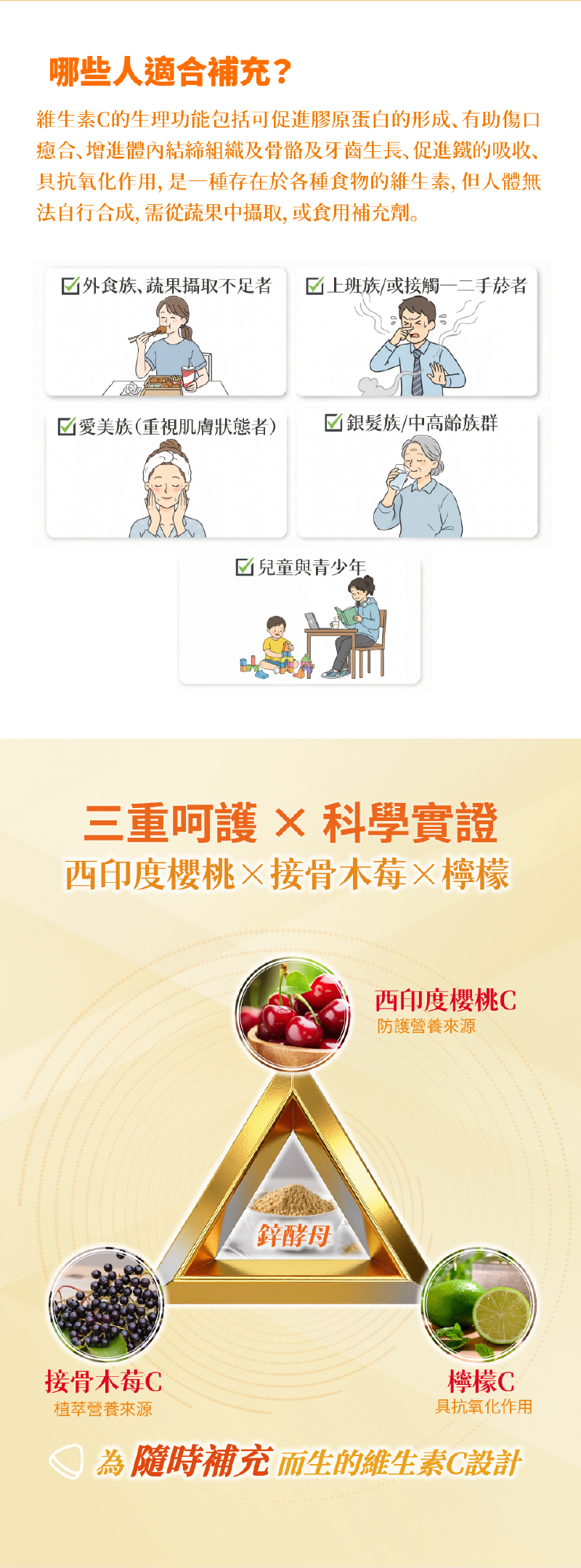 乳糖 (乳糖、麥芽糊精)、西印度櫻桃粉 (西印度櫻桃濃縮汁、麥芽糊精)、檸檬粉 (檸檬原汁、麥芽糖漿)、橘子粉 (橘子濃縮汁、麥芽糊精)、專利接骨木萃取粉 (接骨木、麥芽糊精))、抗壞血酸 (維生素C)、L-阿拉伯糖、硬脂酸鎂、鋅酵母