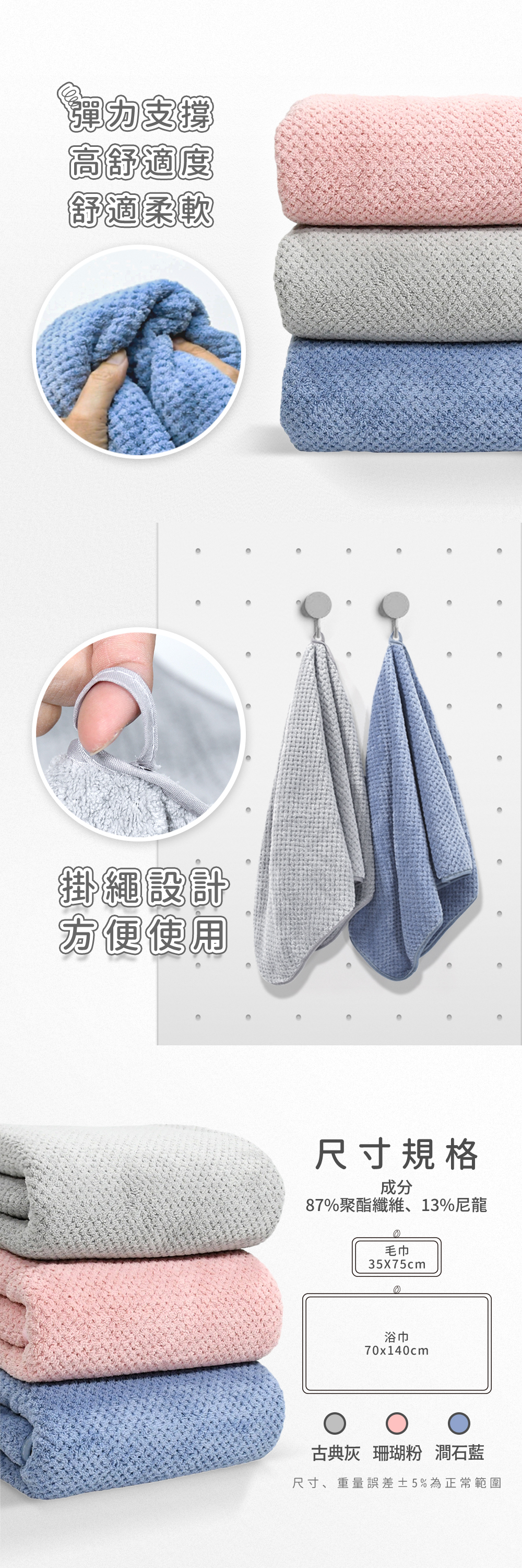 不論毛巾、浴巾皆有掛繩設計,方便晾乾、收納。