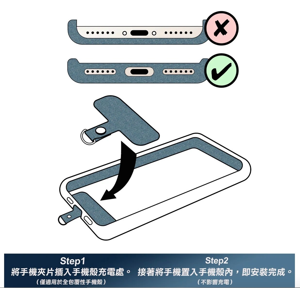 1. 手機夾片須有一定厚度來抵抗拉力,因此不同類形的手機殼如機殼開孔太細、不具彈性的材質有可能不適合使用,敬請留意。