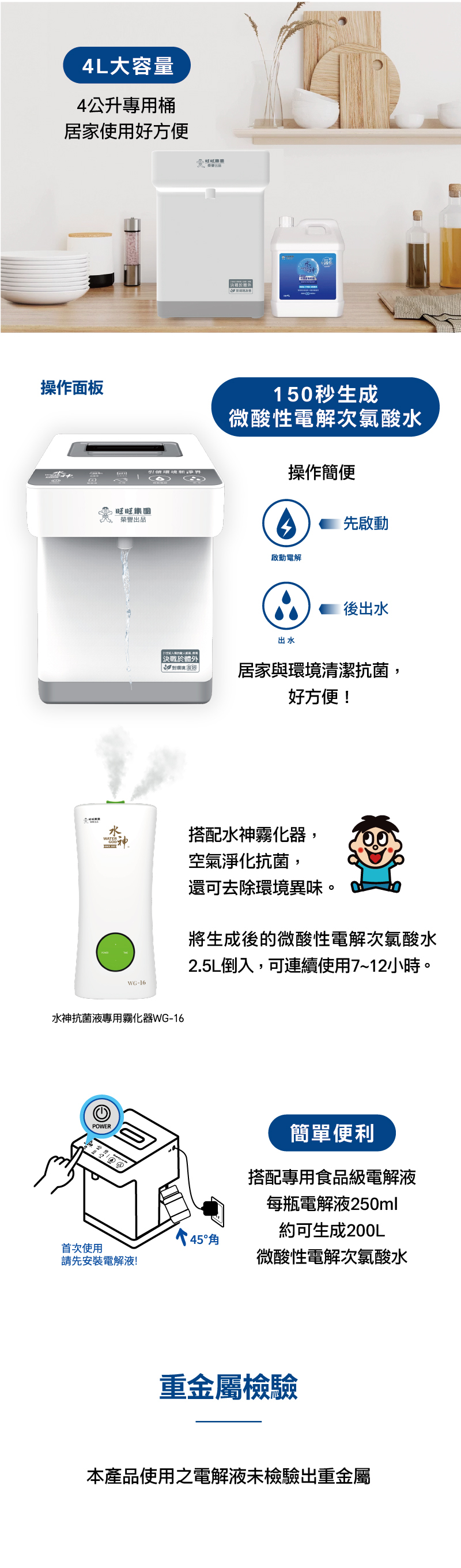 注意事項:水神專用霧化器無法添加水神抗菌液以外的任何液體,如:精油、香精…等等,以免縮短機器使用壽命或造成損壞。