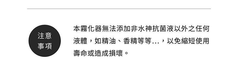 ● 本霧化器無法添加非水神抗菌液以外之任何液體。